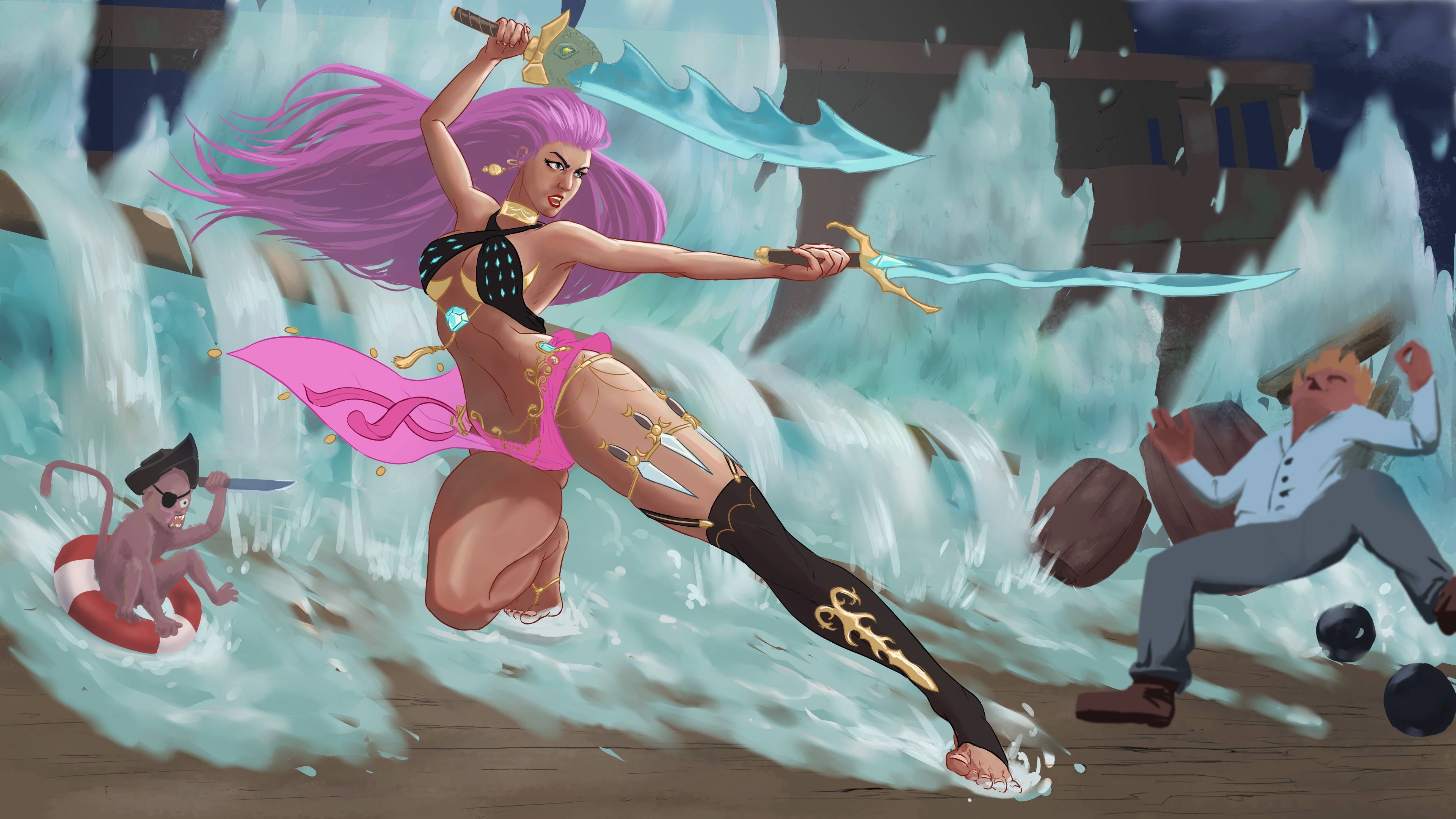 Je suis parti sur Lame Bleue qui participe à un abordage. J'ai tenté de rendre la scène dynamique possible façon splashart.