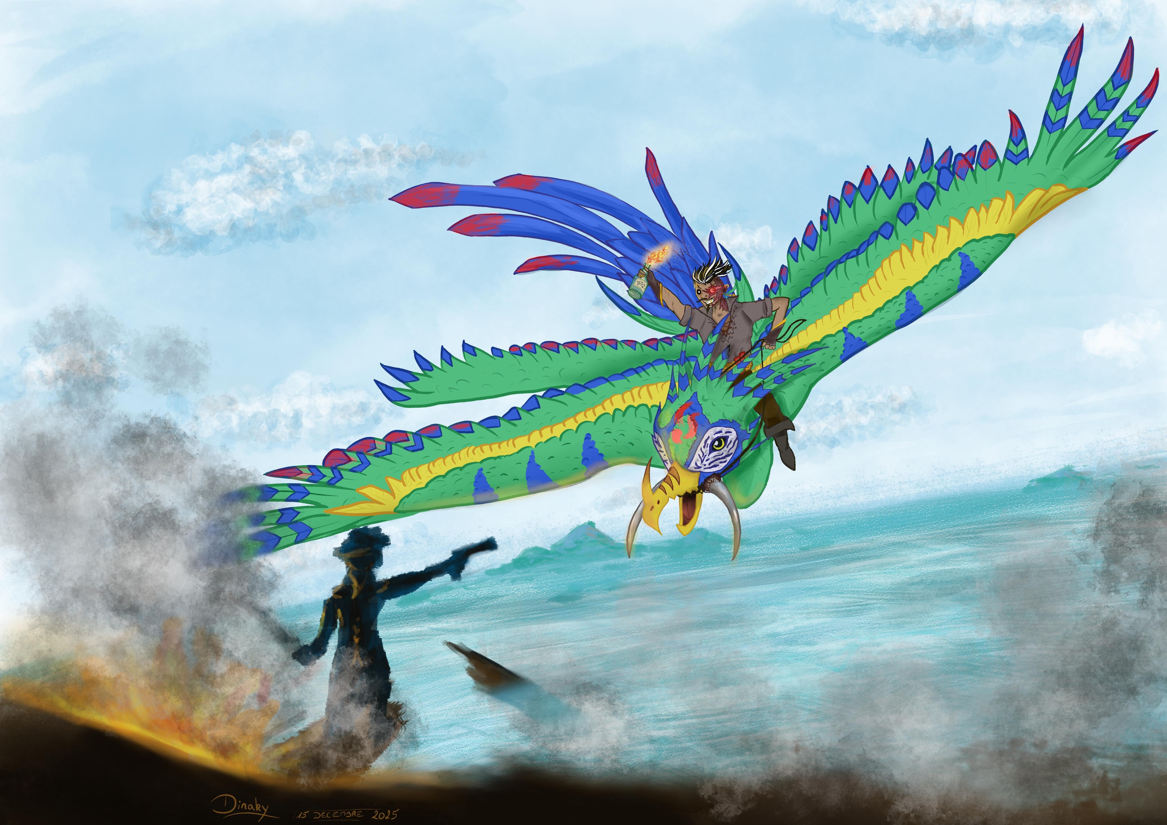 Voici ma participation à ce 20e challenge, j'espère qu'elle vous plaira :) J'ai choisi d'y représenter Crève-Feu et son ptérodactyle en pleine attaque, le malheureux capitaine qui leur fait face ne fera probablement pas long feu !