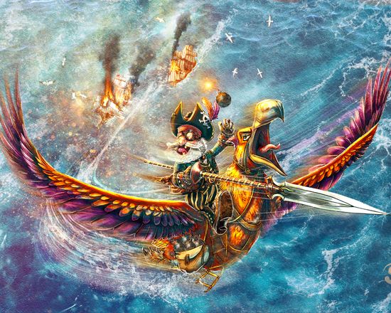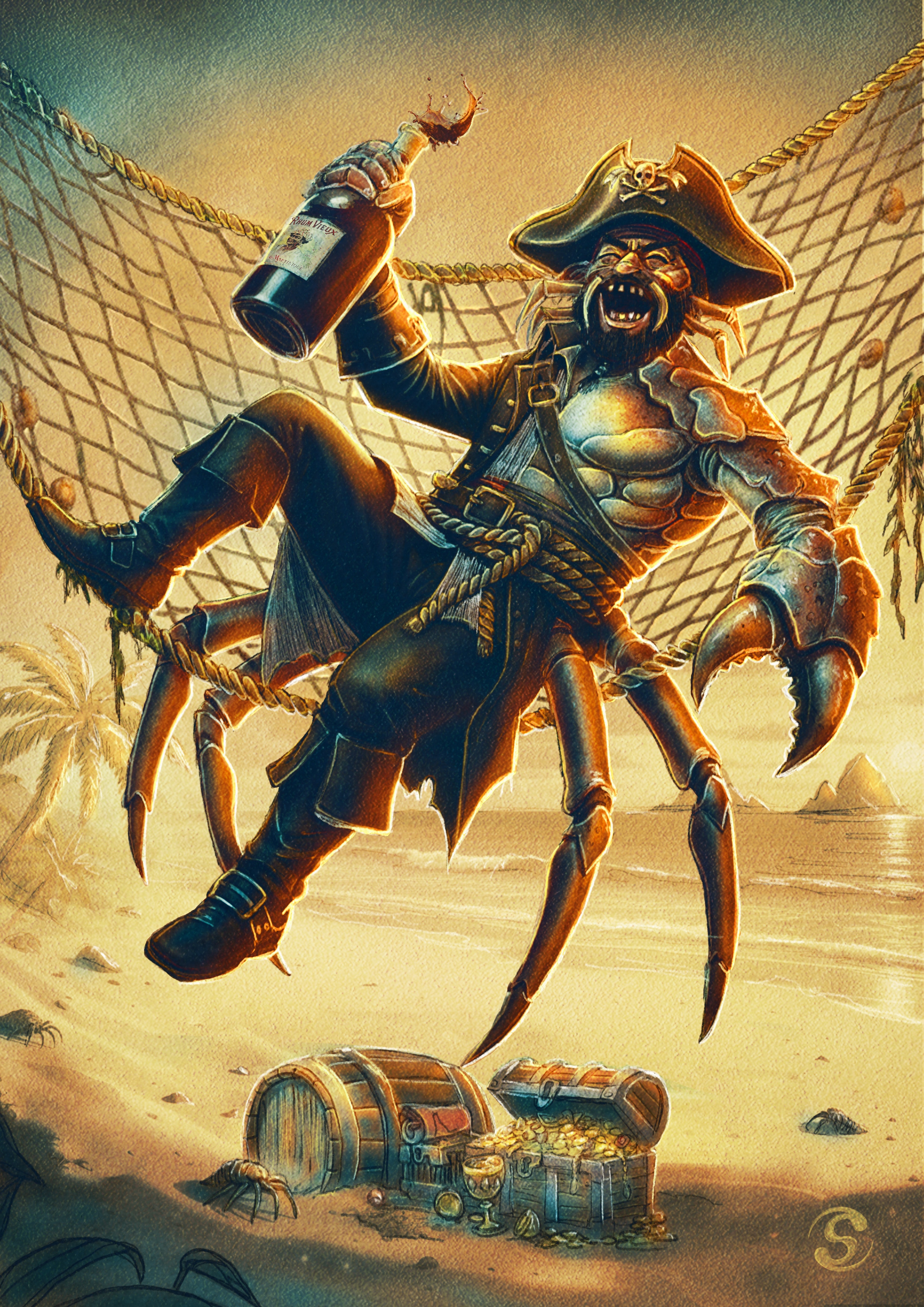 Voici le pirate "Tête de crabe". Je le voulais effrayant presque monstrueux mais à la fois sympathique et joviale puisque blagueur. C'est tout naturellement qu'il s'est retrouvé dans un hamac à rire aux éclats avec une bonne bouteille de rhum vieux.