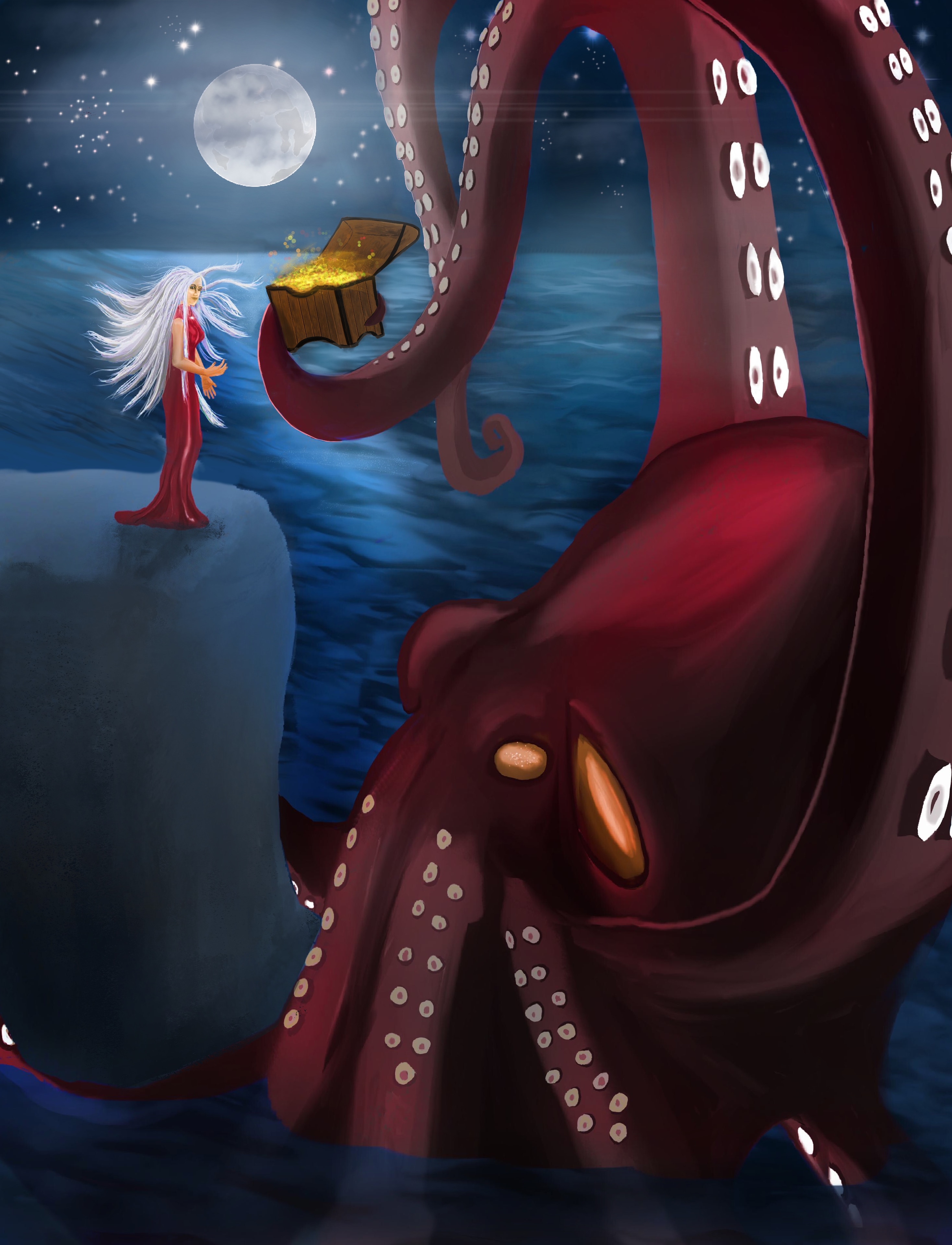 L’illustration présente le moment où le kraken vient offrir le trésor à Katryna, en gage d’amour.