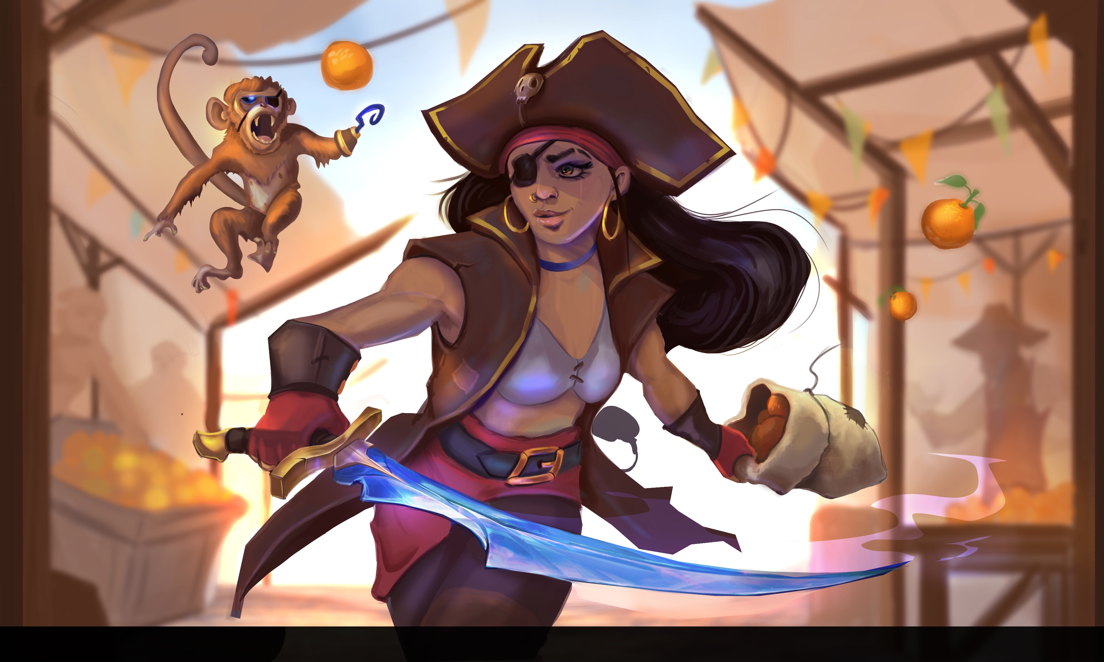 Comme à son habitude elle déambule sur le marché de l'ile perdue des pirates recherchés. Elle dérobe des ranges sur le marché pour son équipage en quête d'un nouveau butin. Historiquement tous les pirates mangeaient des oranges... cela évitait les carences en vitamine C et le Scorbut. Toujours accompagné par son fidèle compagnon tumus, un singe maudit par sa lame bleue, une lame trouvée mais dont on ignore encore les origines...