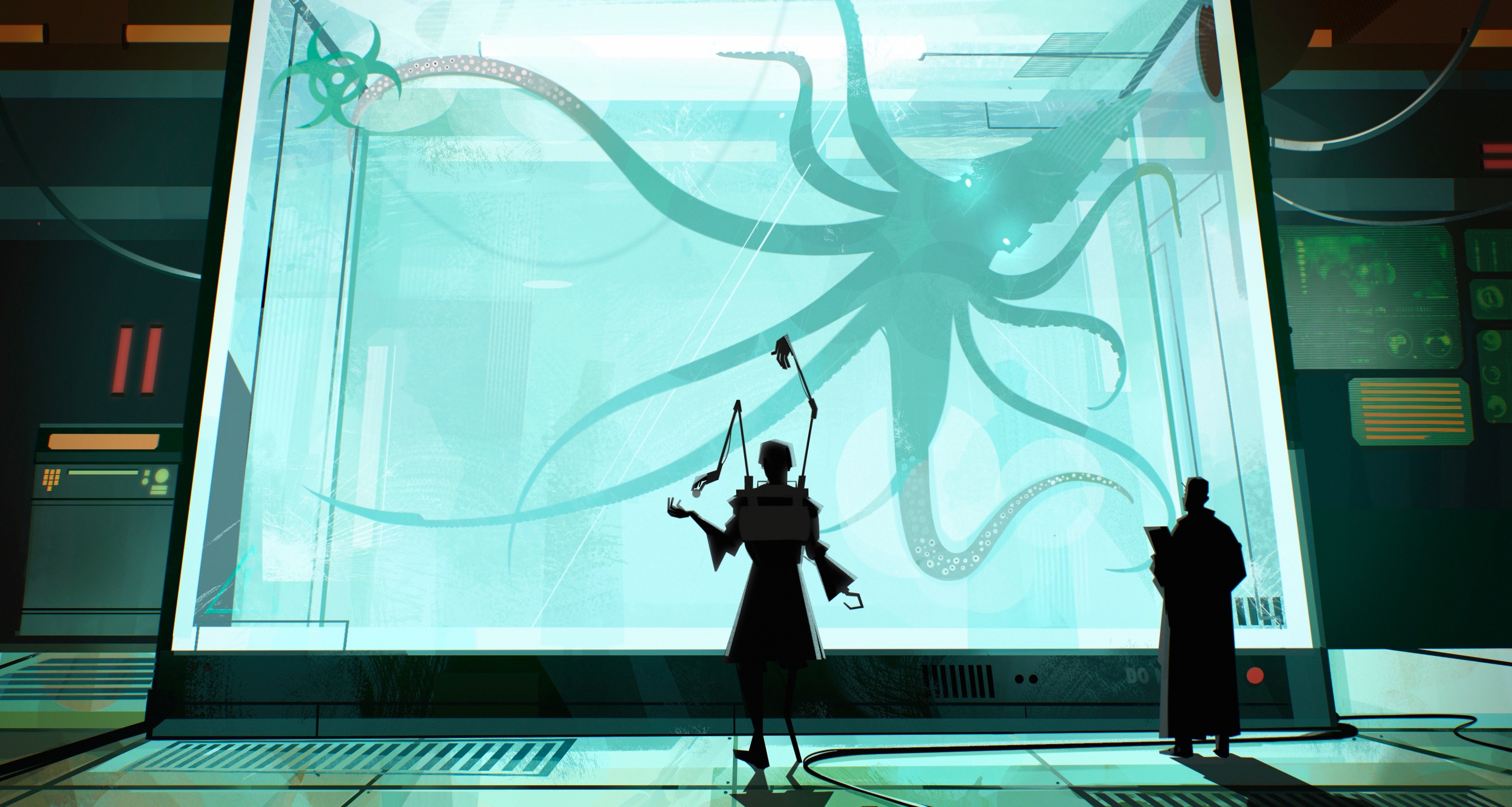 Pour ma participation, j’ai choisi Ned, le pirate chercheur. Je l’ai imaginé après la capture d’une nouvelle espèce de Calmar dans son laboratoire. Ned et ses collègues chercheurs étudient alors les caractéristiques de ce géant. Ned, qui veut toujours être plus efficace dans son travail, s’est construit un appareil à bras mécaniques qui lui permet de faire plusieurs choses à la fois. Son laboratoire se trouve sous Bikini Bottom est possède un accès direct à la mer où Ned peut observer les espèces dans leur habitat naturel.