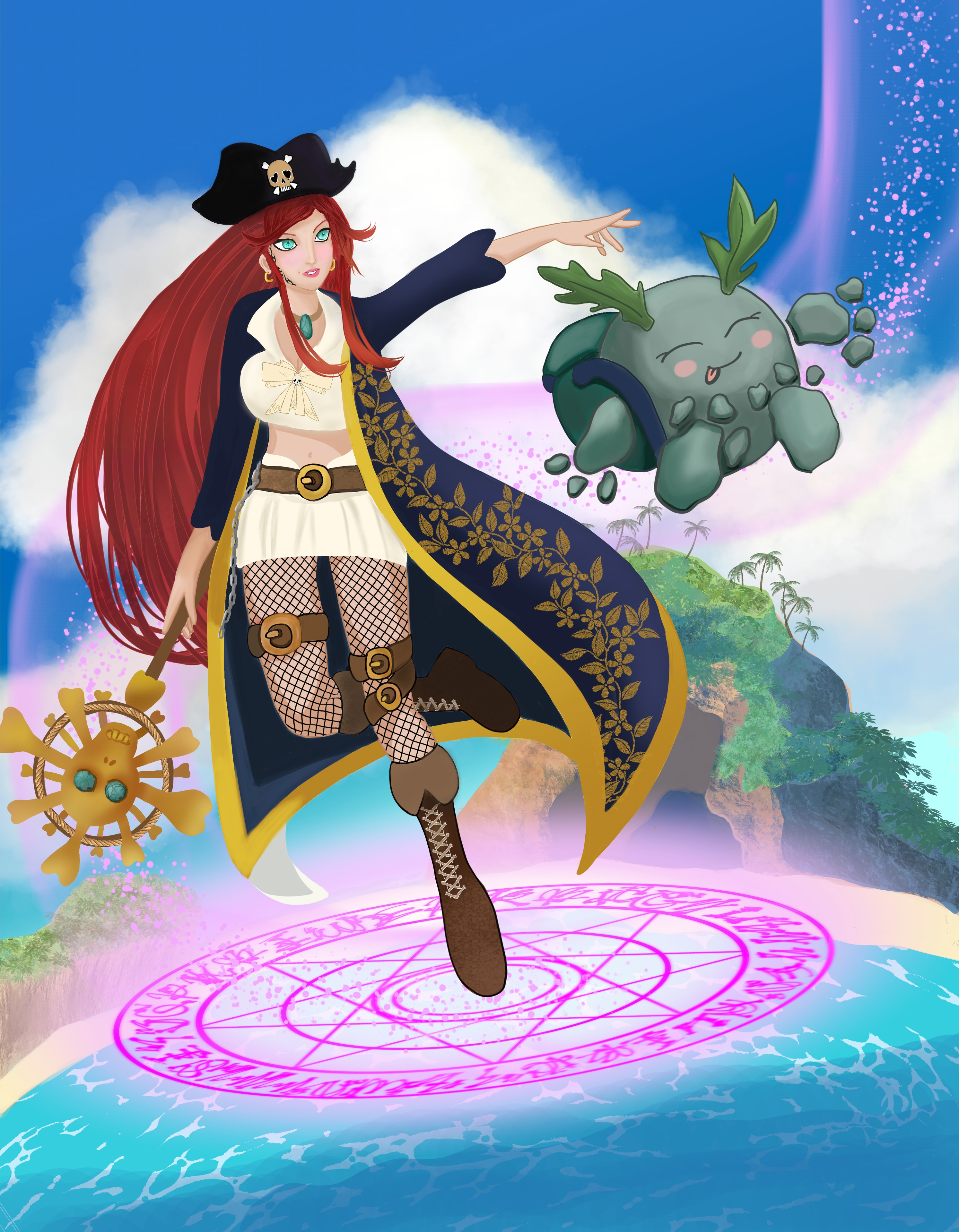 C'est ma première participation au challenge. Je voulais voir mon évolution. En effet je me suis mise au DP sérieusement il y a 4 mois avec la formation indispensable partie1. Je suis plutôt contente de ce que je parviens à faire en étant partie de zero. Une scène avec personnages et paysage. J'ai choisi Katryna car j'ai toujours eu une préférence pour dessiner les personnages féminins. C'est une invocatrice séductrice ce qui m'a inspiré le pentagramme et donc j'ai pu testé un effet magique. Son arme est un bâton composé de os de ses ennemis qu'elle a transformé en "or". J'ai ajouté également Sakado le gollem qu'elle invoque mais version kawaii composé de roche et d'algues et portant son sac à dos. En fond j'ai représenté le paysage des iles pirates dans une mer bleu azur et en avant plan on peut voir que l'eau est plus foncée assombrie : un danger émergeant. J'ai encore pas mal de points "faibles" comme les ombrages lumière. Mais l'ensemble reflète plutôt bien ce que j'imaginais dans ma tête donc c'est une réelle satisfaction de parvenir déjà en si peu de temps à coucher sur "papier" ses idées.
