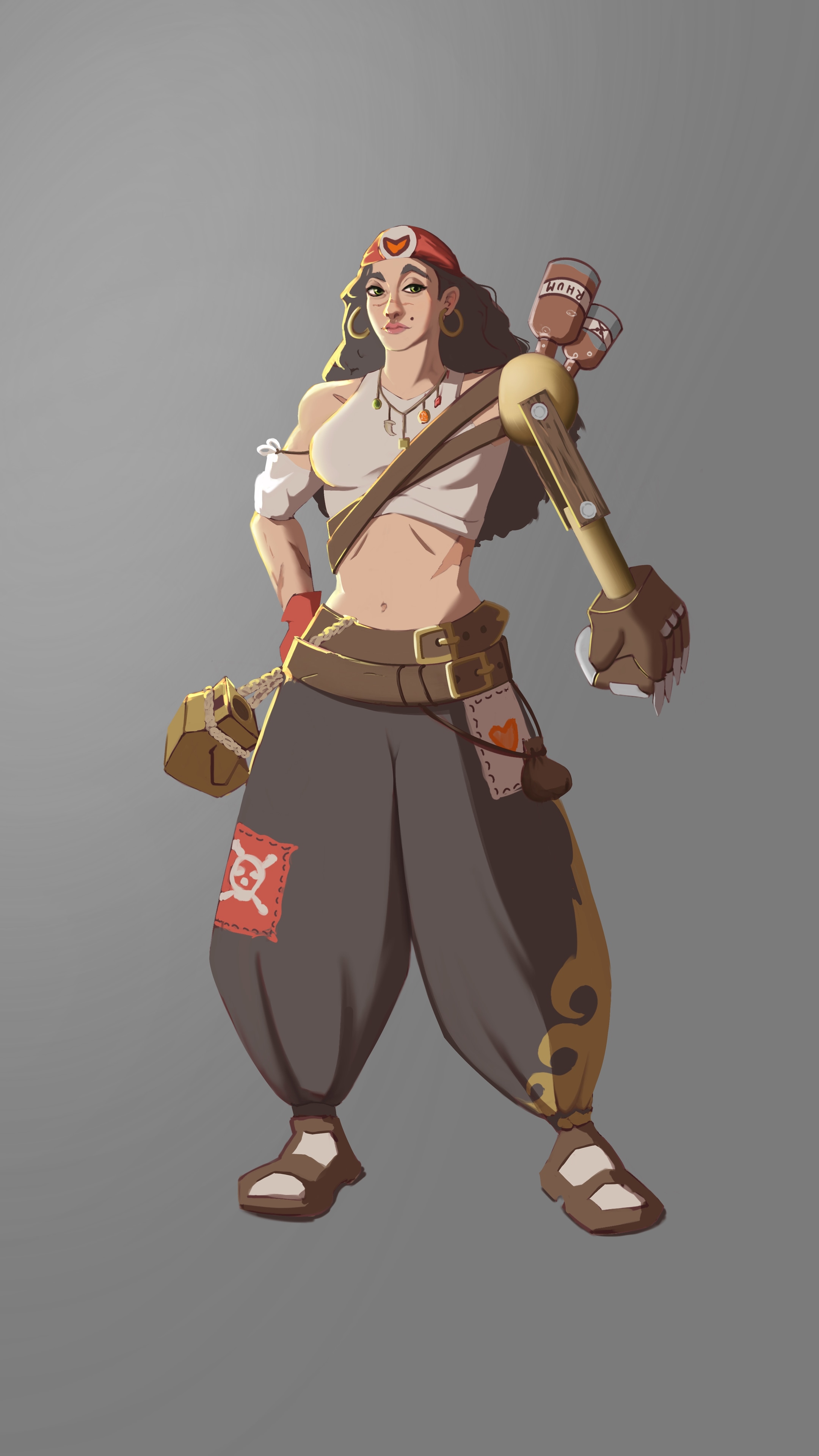 Avant de me lancer dans cette super aventure de concept art, j’ai d’abord analysé et décortiqué le brief. Comment une pirate peut elle se prénommer Grospoings avec un poings en moins. C’est là que met venu à l’esprit le système de prothèse à gros poings. C’est le brief qui m’a le plus inspiré et pour lequel j’ai pris soins d’analyser chaque détails qui fait d’elle, qui elle est ! J’ai essayé de le re transcrire au mieux au travers de sa posture, des couleurs ou même de sa tenue. C’est une pirate intrépide, fière, forte sans peur mais casse cou et dynamique.