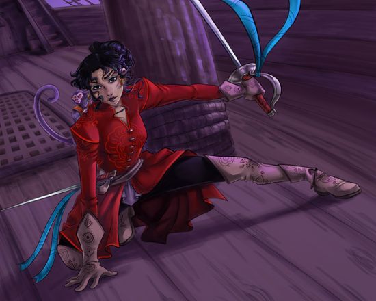 Concernant son design, je voulais vraiment la faire assez large d'épaule mais tout en restant charmante. Quant à son bras artificiel, je le voyais bien fait avec toutes sortes d'éléments récupérés sur des monstres qu'elle aurait abattu et surtout des morceaux de celui qui aurait possiblement pu emporter son bras perdu, mélangé à du bois et des écrous/clous, pour essayer de faire tenir le tout.
