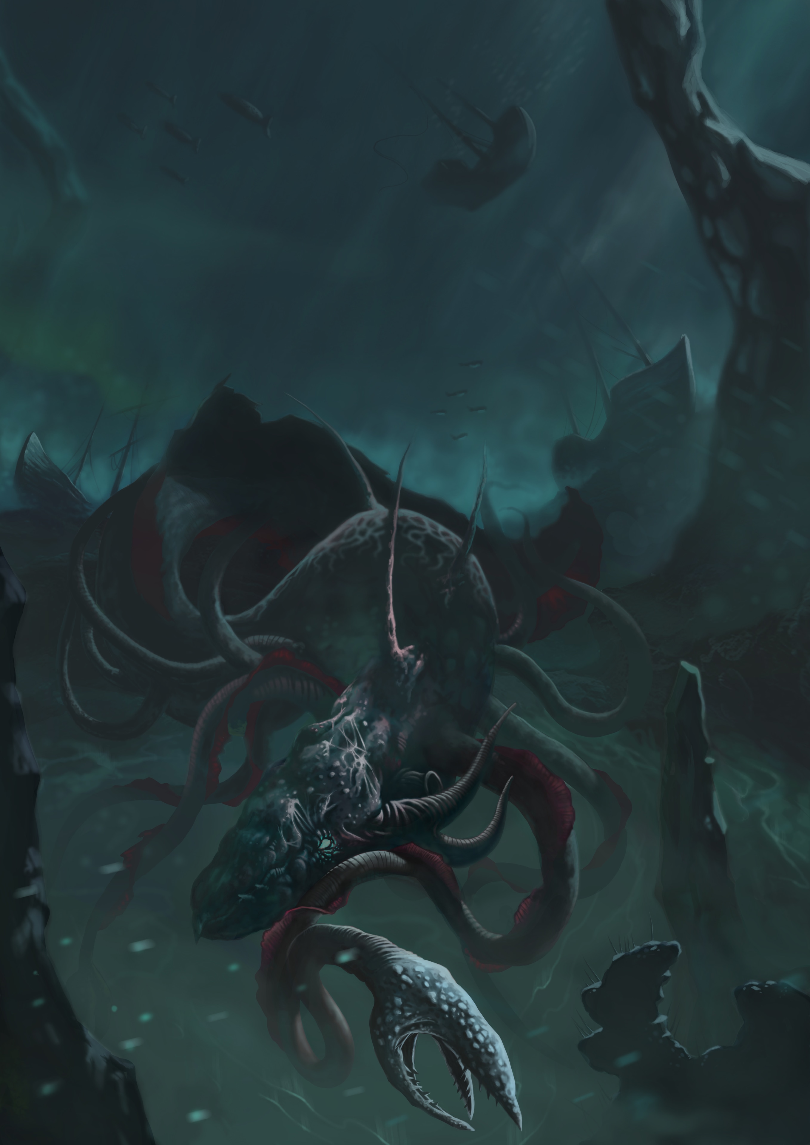 Dans la pénombre du tréfond des mers et des océans, le kraken attend patiemment de pouvoir se nourrir des marins dont il éventre les navires avec ses larges pinces à l'extrémité de ses immenses tentacules .