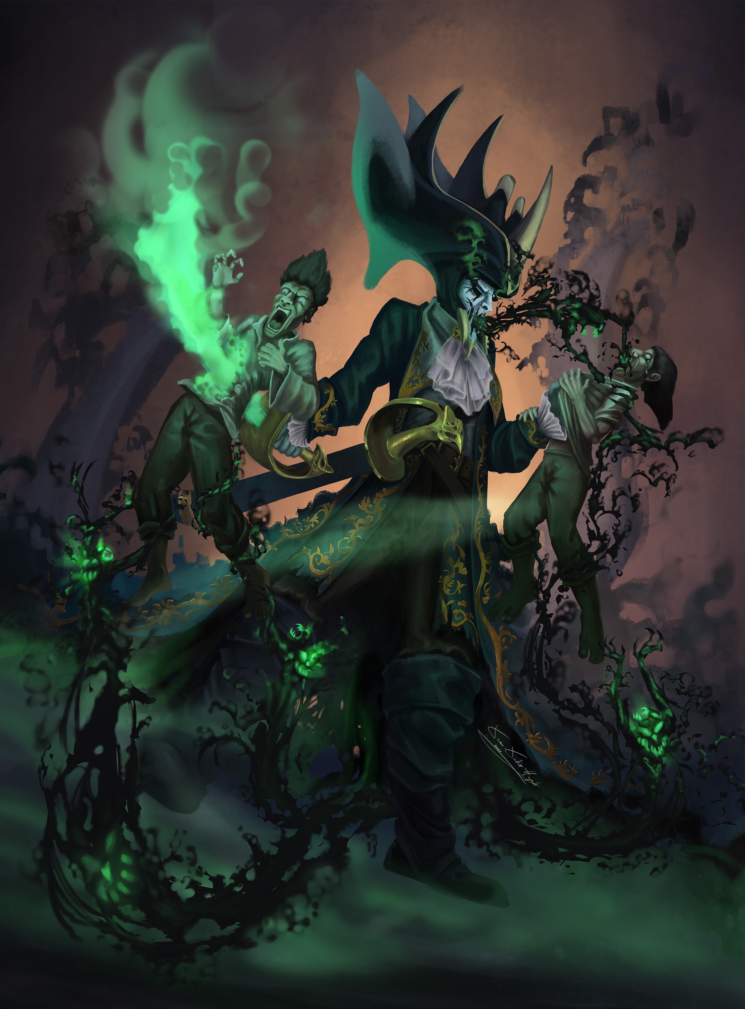 Je commence à réfléchir à l'invocation farfelue de gremlins : l'idée étant que le manteau du capitaine peu à peu se transforme en encre d'où sortent les créatures. Je ne suis pas vraiment satisfait du résultat, n'ayant pas pu représenter avec succès l'effet que j'avais en tête.