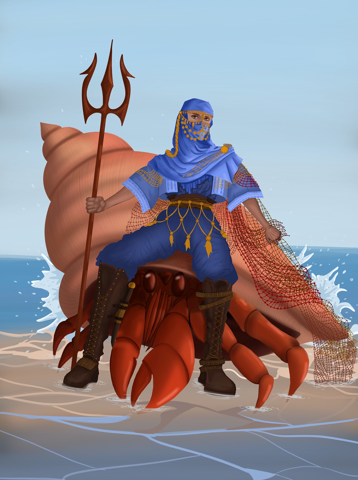 D'une beauté saisissante rarement vue sur les mers, elle cache son visage sous d'épaisses couches de tissus orientaux qu'elle tient de sa famille. Son célèbre surnom provient d'ailleurs de ces fameux tissus, car peu de gens peuvent se vanter d'avoir vu ses lames de près et d'avoir survécu ! Quand elle ne massacre pas ses ennemis, elle passe son temps à chasser des créatures sous-marines avec ses filets et son trident, pour les ajouter à sa collection, a coté de son singe adoré.
