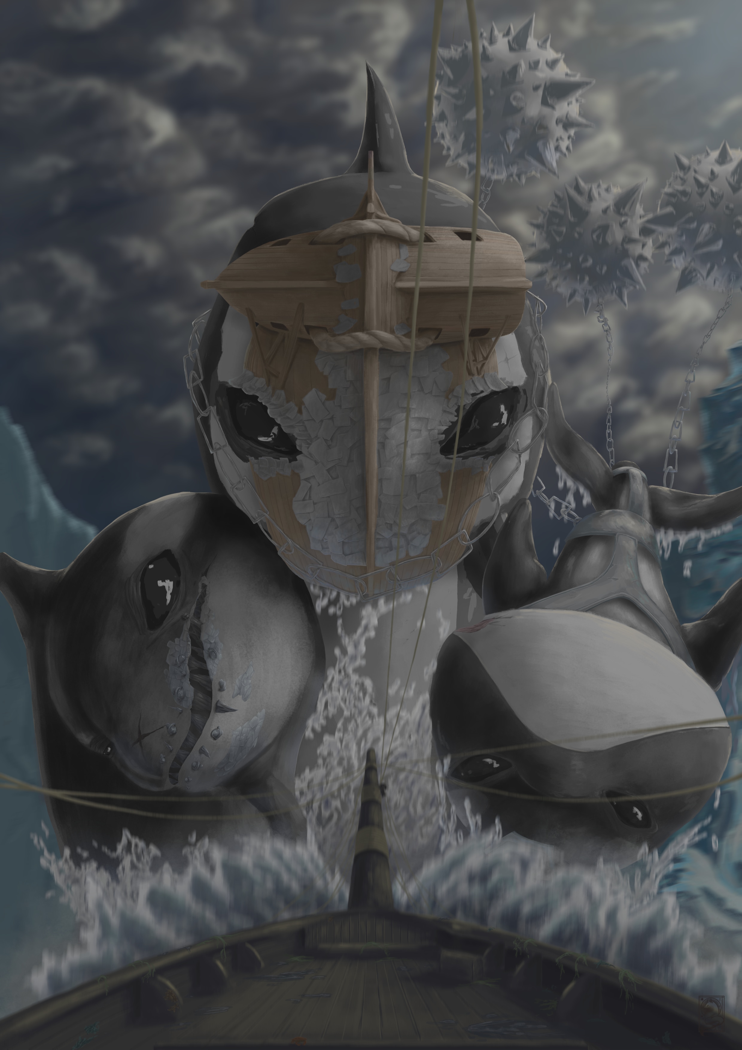 Le troisième, quant à lui, traîne derrière lui trois chaînes, chacune terminée par un énorme boulet de métal piquant. Il s’en sert comme de véritables mines, passant à proximité des navires pour s’y frotter et les faire couler. Il lui arrive également d’exécuter une acrobatie redoutable : utilisant la puissance de sa queue et la gravité, il projette ses boulets vers l’avant afin d’écraser les navires par le dessus.