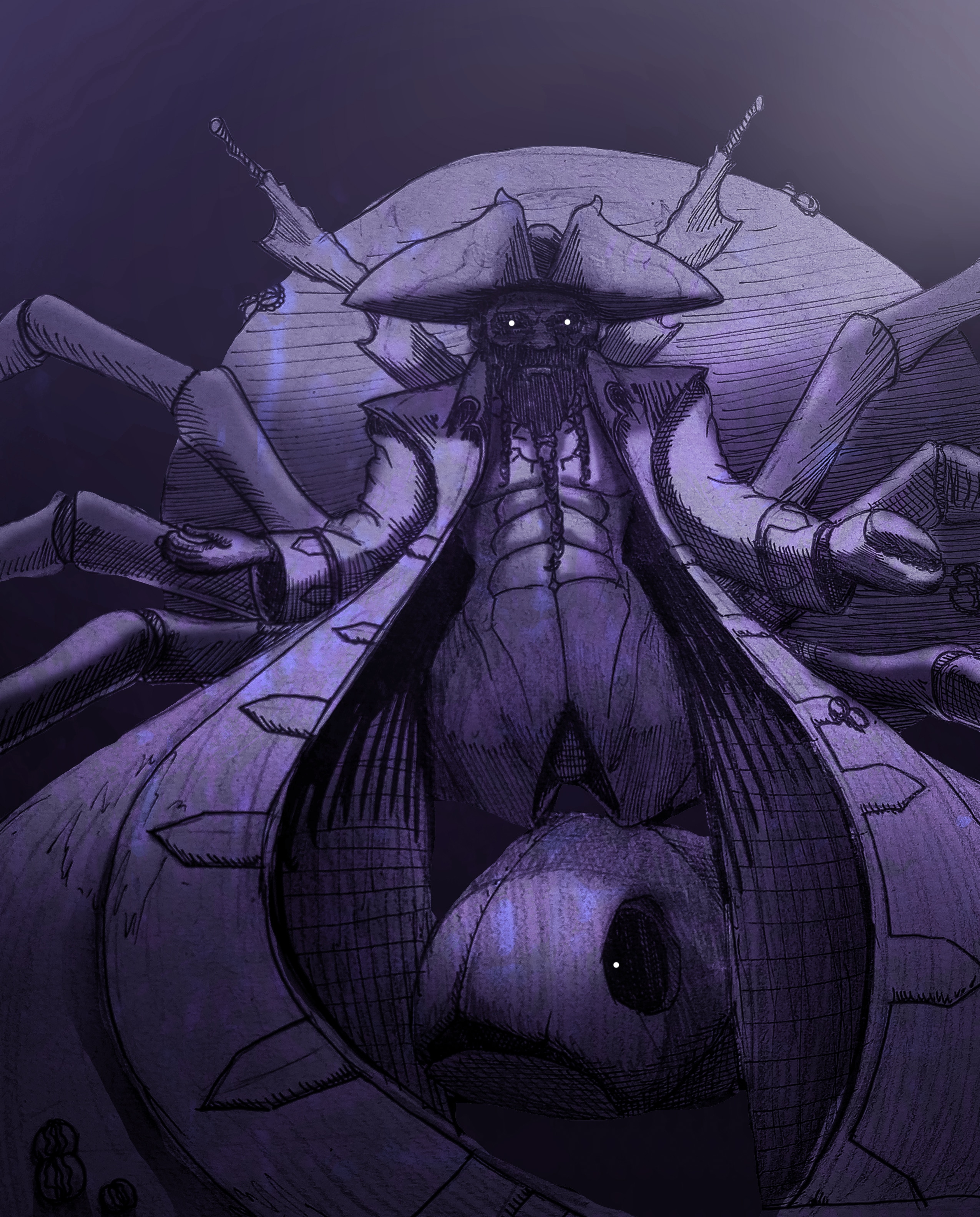 "Voici la Grande terreur des mers, celui qu'on ne peut voir sans payer de sa vie. La seule et unique noirceur de l'océan, toujours équipé de ses deux sabres coralien ainsi que de son esprit aquatique. La légende raconte que l'esprit qui l'accompagne est similaire à un squelette de poisson, d'autre parle d'un fantôme mais personne ne peu et ne pourra le savoir sans en payé le prix fort ! Concernant la terreur, on raconte que c'est un pirate maudit par les siens car bien trop envieux de son destin de noble et de riche pirate, les siens voulais sa perte pour en bénéficier tout autant mais au lieu de cela ils lui on donner l'opportunité de devenir celui qu'il est aujourd'hui ! Son envie de ne pas perdre ses privilège lui on pousser à devenir ce pirate sanguinaire qui déchaine les mer de sang à bord de son navire fait d'âme de ses anciens ennemis au fil du temps ils en à payer le prix ! Il devient chaque année de plus en plus monstrueux physiquement et mentalement, jusqu'à peut être un jour devenir la créature ultime des mers".