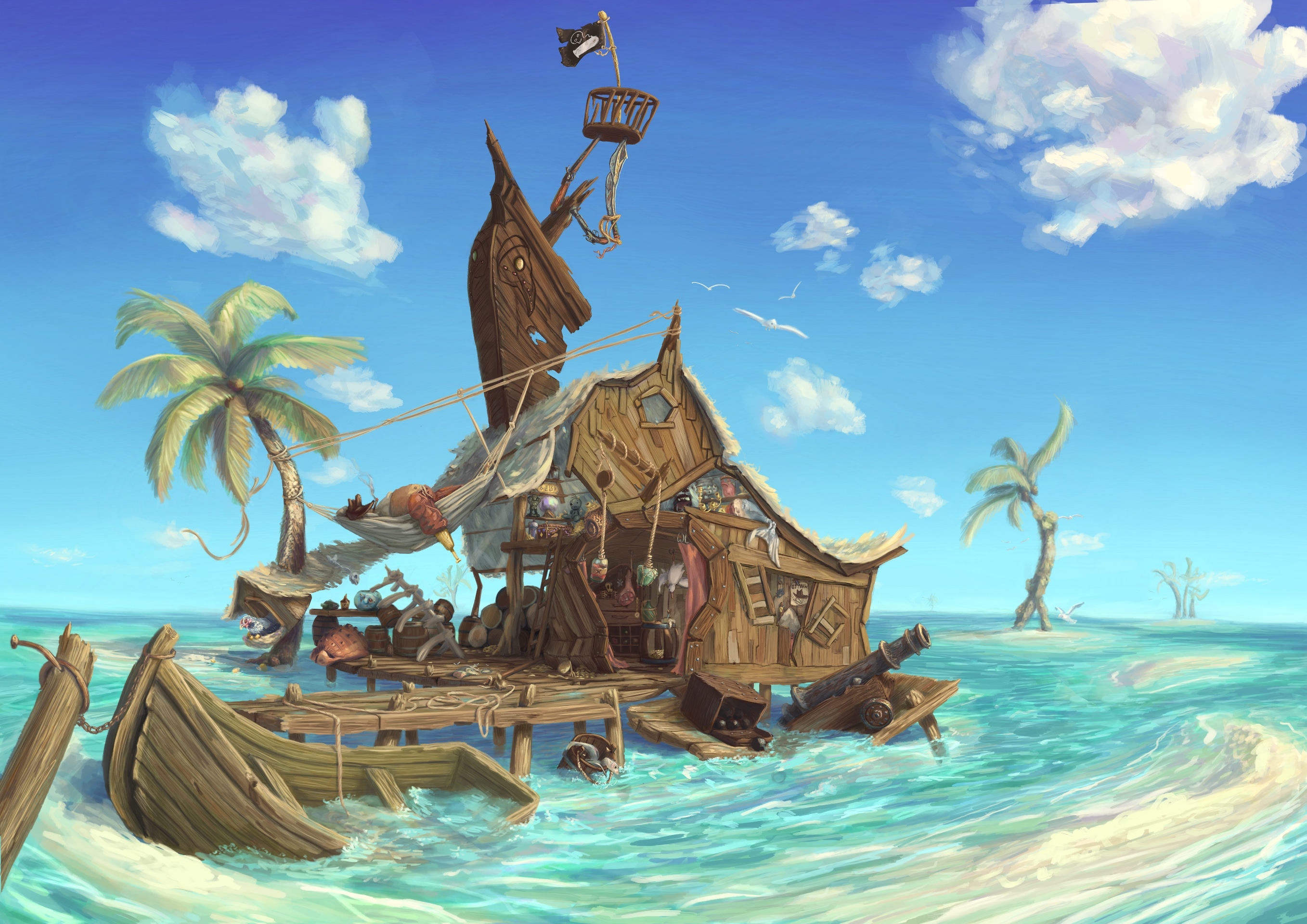 J'ai directement imaginé une cabane un peu bancale, construite par un pirate qui se fiche des apparences "propres" tout en étant fier de son passé de pirate, pas forcément très solide ni très droit vu qu'il n'est pas architecte ni maçon. La retraire de ce pirate date déjà de quelques temps, La kabane a vécu, est un peu cassée par endroits, et notre pirate est bien trop occupé à se la couler douce pour réparer quoi que ce soit !