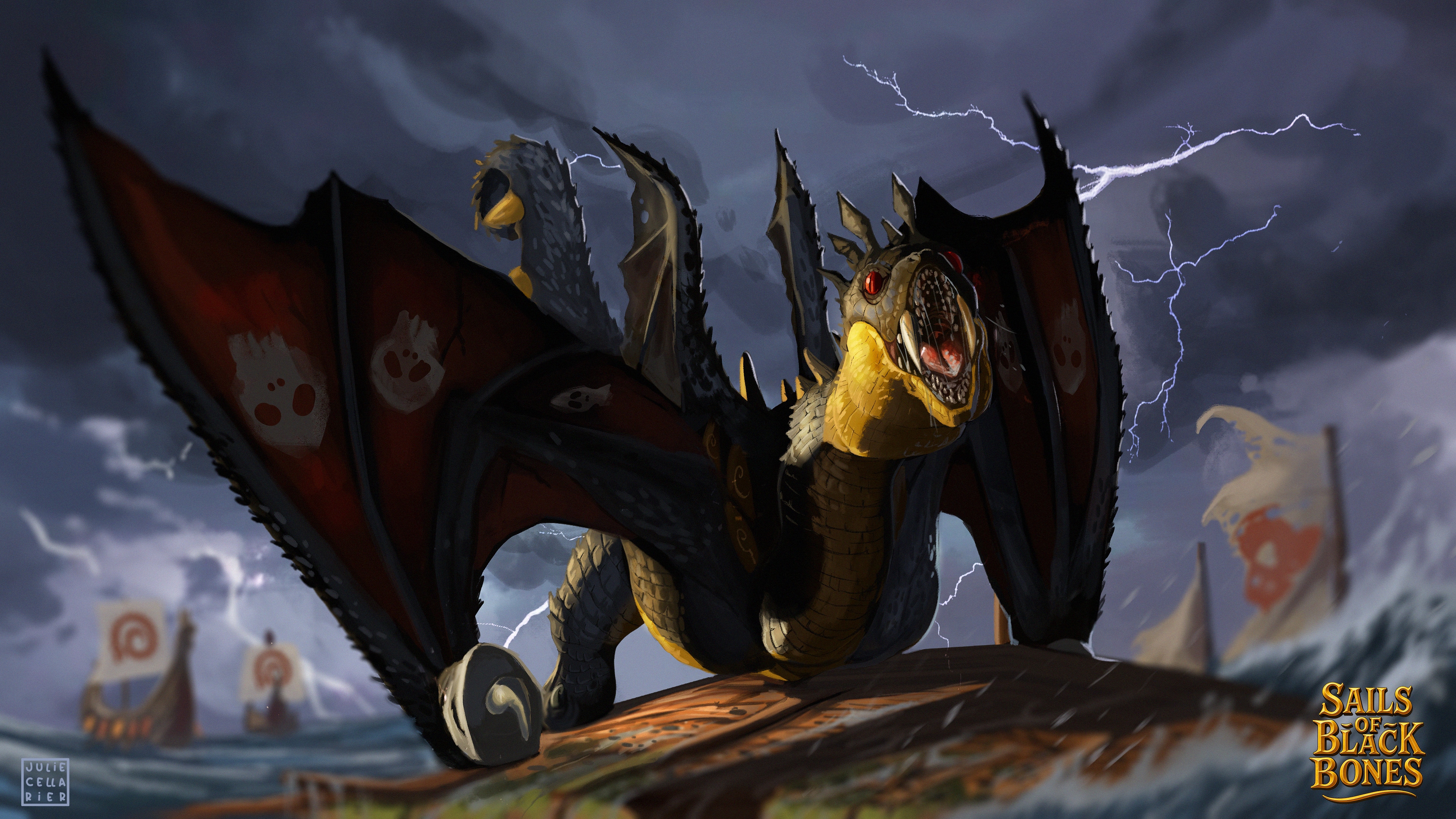 J'ai choisi pour ce challenge de représenter le Nidhögg ! Je me suis dis qu'il serait intéressant pour ce dragon-serpent que son allure rejoigne celle des drakkars pour l'inclure d'autant plus dans cet univers de pirates vikings. Dans mon illustration finale, le Nidhögg se pose sur la coque d'un bateau qu'il vient de renverser, des drakkars arrivent au loin pour le rejoindre dans cette bataille.