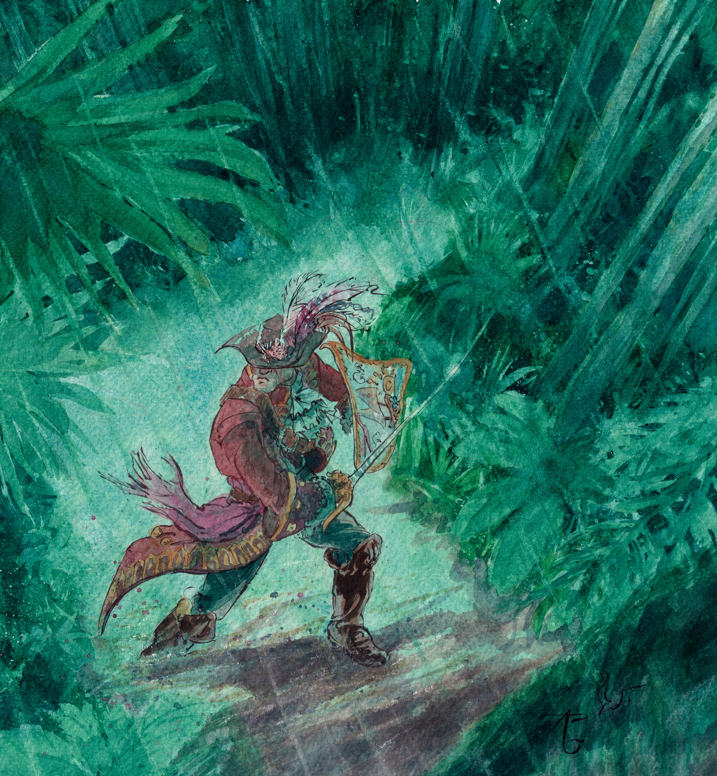 Il est pas à la fête notre Thomas Pearl. Perdu dans une jungle tropicale hostile, surveillant mystérieusement ses arrières. Pourtant, il faudra bien la traverser pour atteindre le volcan de l’île d’Isla Nublar. On dit que c’est là que se cache la grotte au trésor du Black Bones.