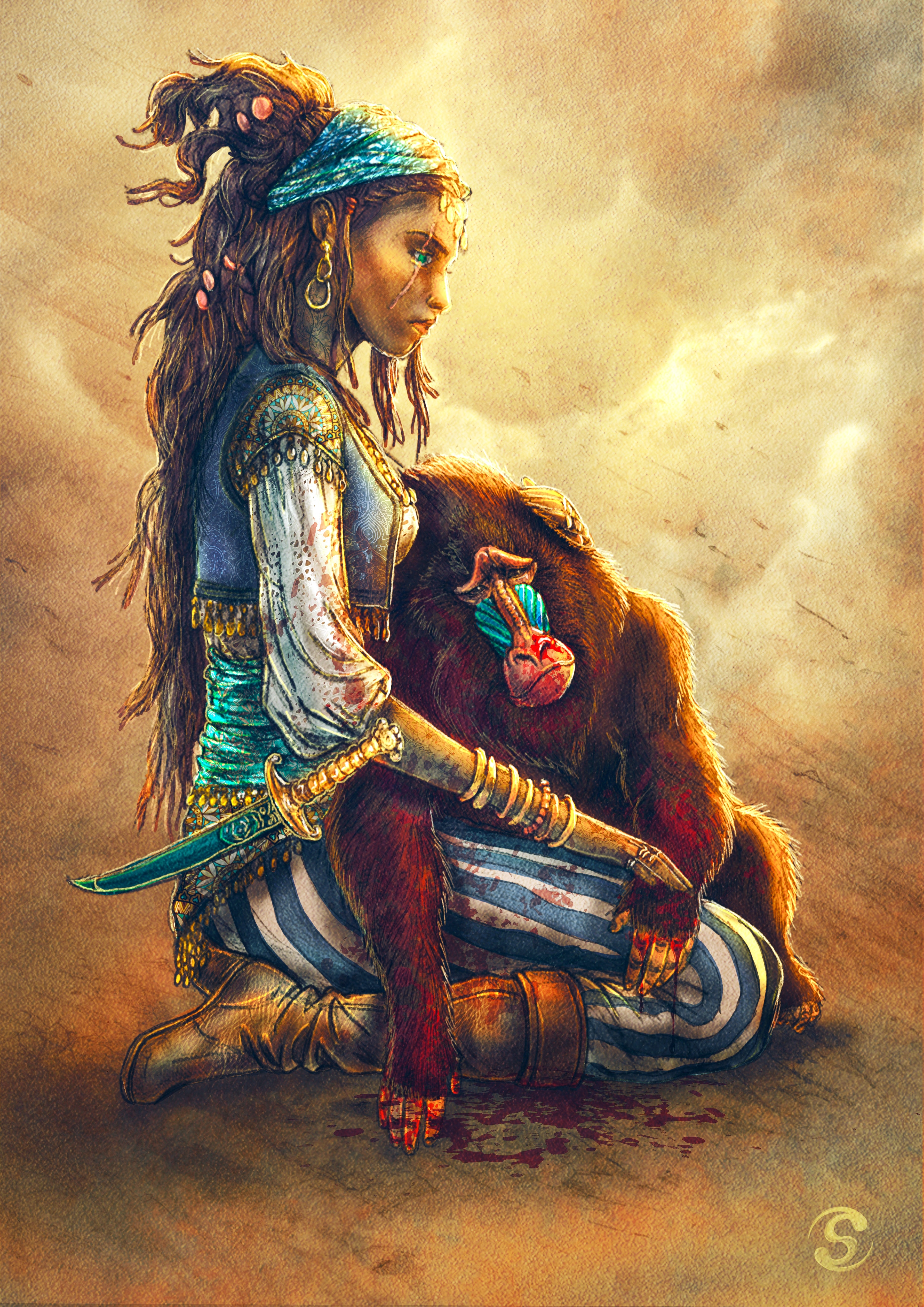 J'ai voulu montrer un autre aspect de cette aventurière basée sur l'émotion et en particulier la rencontre avec le mandrill, qui va devenir son ami de toujours ! Elle est jeune et n'a pas encore tout l'arsenal d'armes blanches qu'elle maîtrisera à la perfection mais elle a ce regard déterminé qui fera sa renommée.