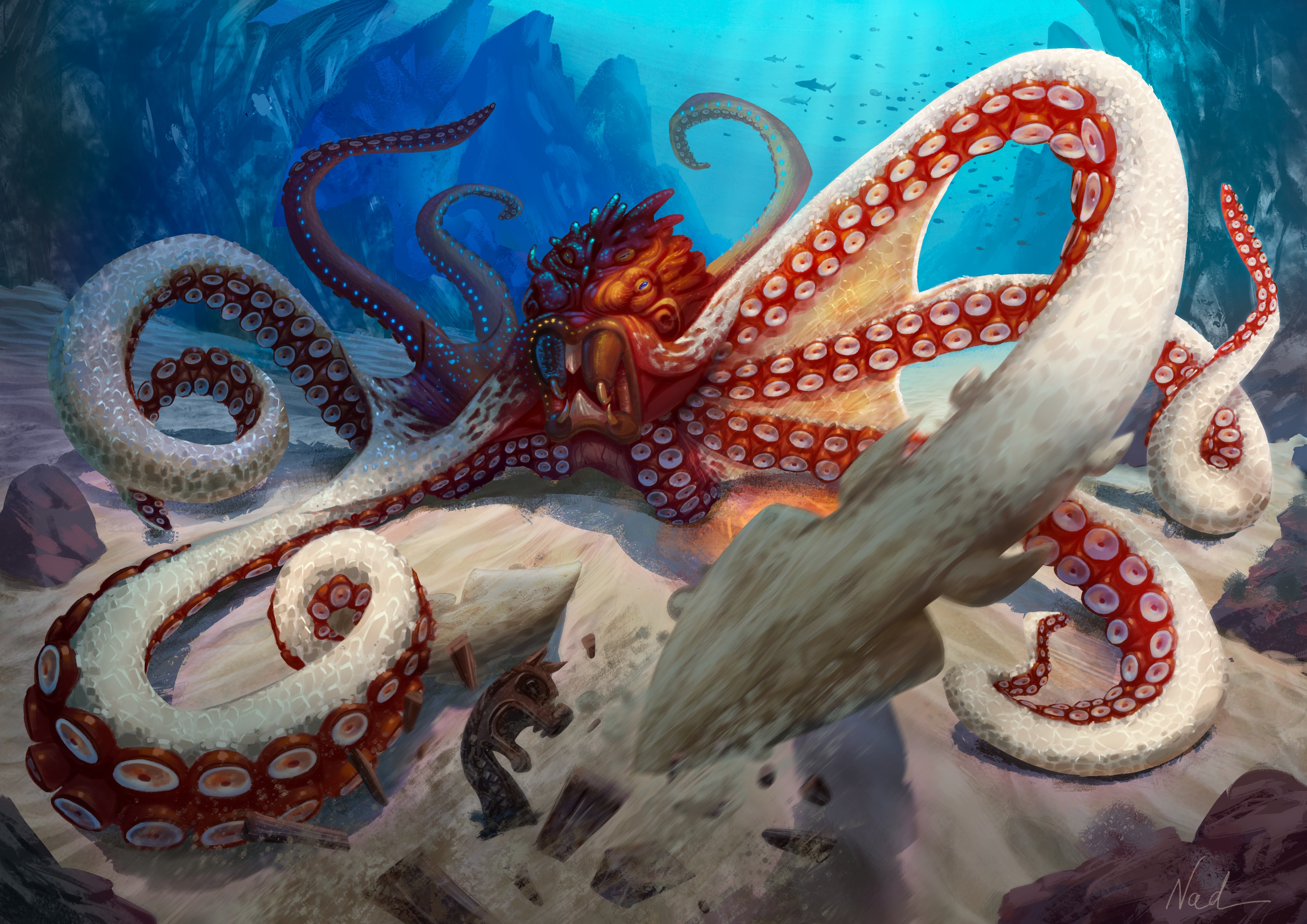 J'avais envie de représenter le kraken avec la faculté qui me fascine chez les pieuvres : la camouflage, voir le mimétisme de certaines espèces. C'est une capacité qui peut être redoutable. Je voulais également me détacher un peu du poulpe tel qu'on le connaît et lui donner une gueule un peu plus personnalisée ^^.