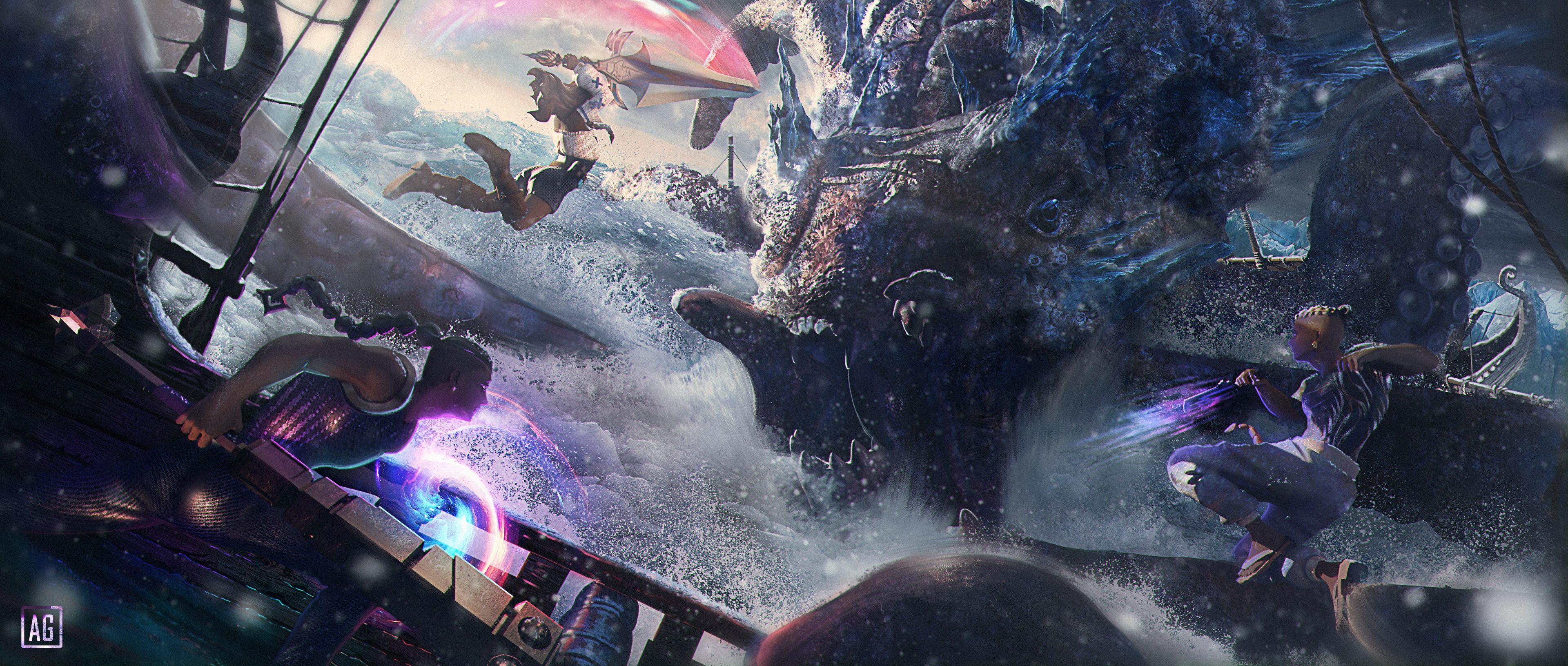 J’ai fait le Kraken en sujet principal, avec des personnages qui sont deux chara perso les deux garcons et le personnage feminin une amie.
