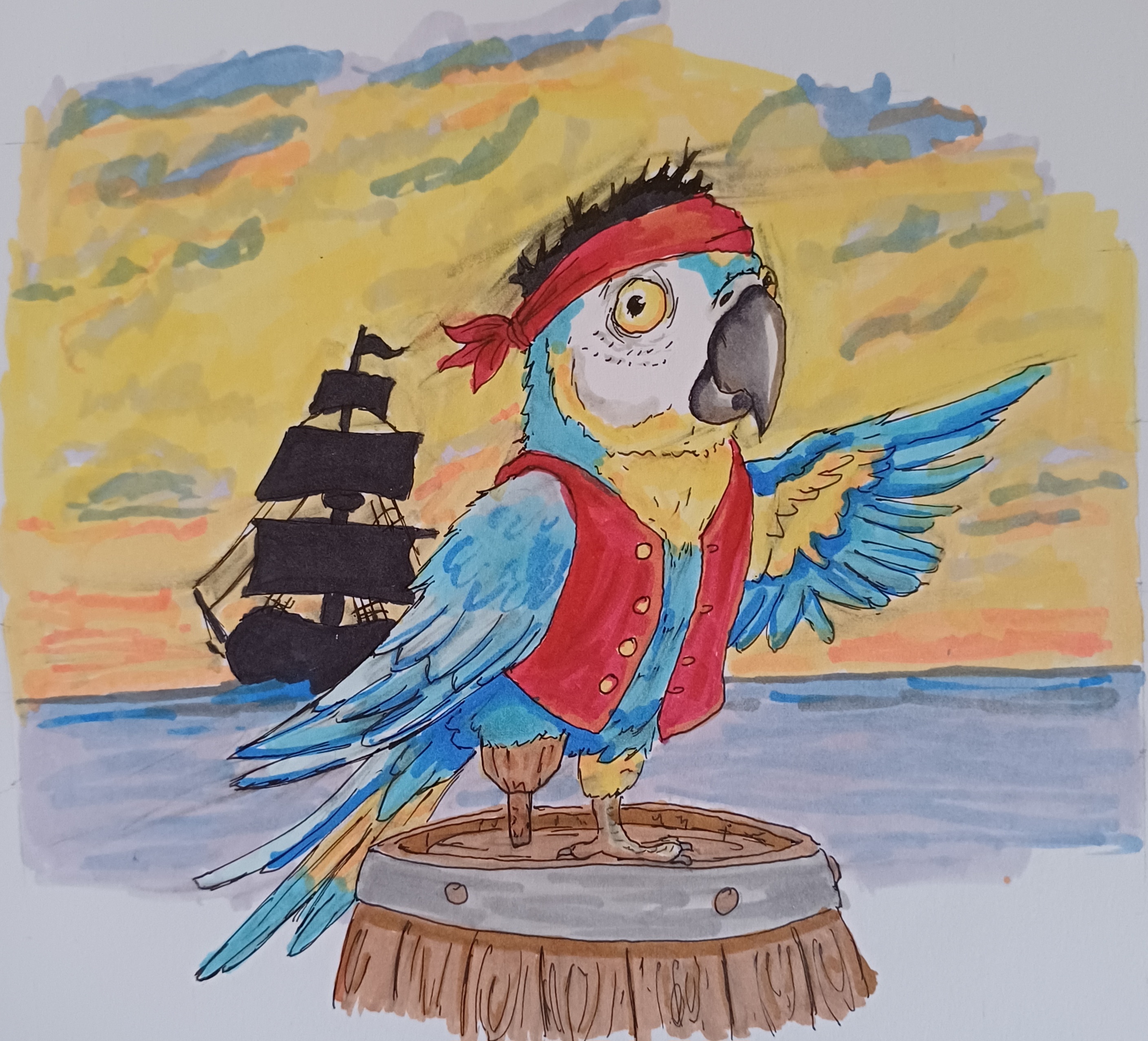 Une patte de bois, souvenir d'un faux pas, Des plumes roussies, on ne sait pourquoi Sur ses épaules, un petit gilet de pirate, Cet oiseau allumé n'a aucune crainte