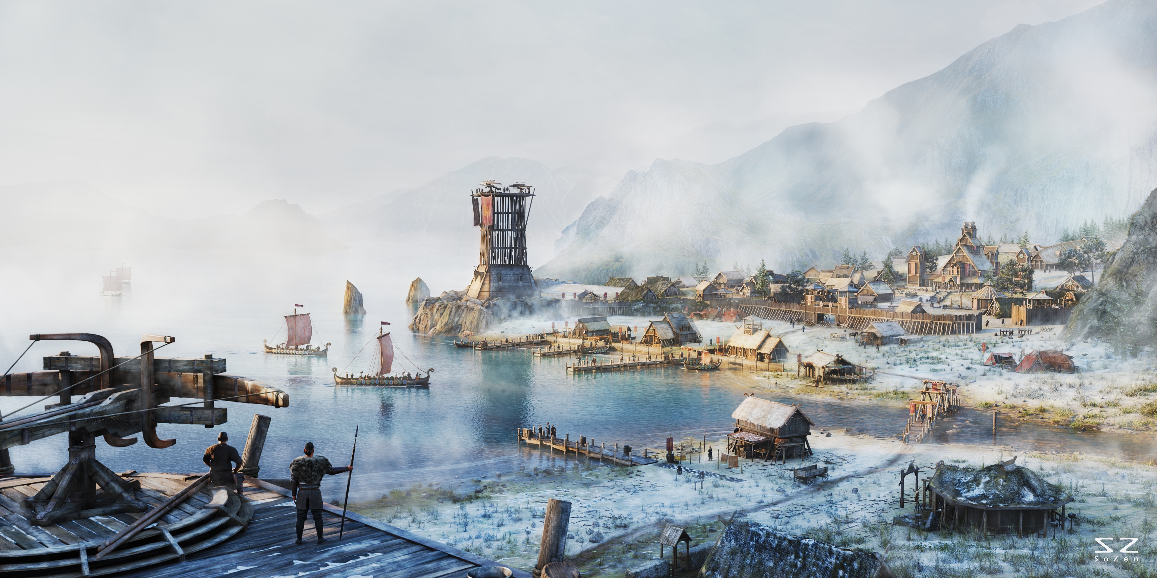 Pour la petite histoire : Un retour de raid sous l'observation attentive des balistes, l'ambiance est froide mais le retour des vikings s'annonce chaleureux comme les rayons lumineux qui les accompagnent.