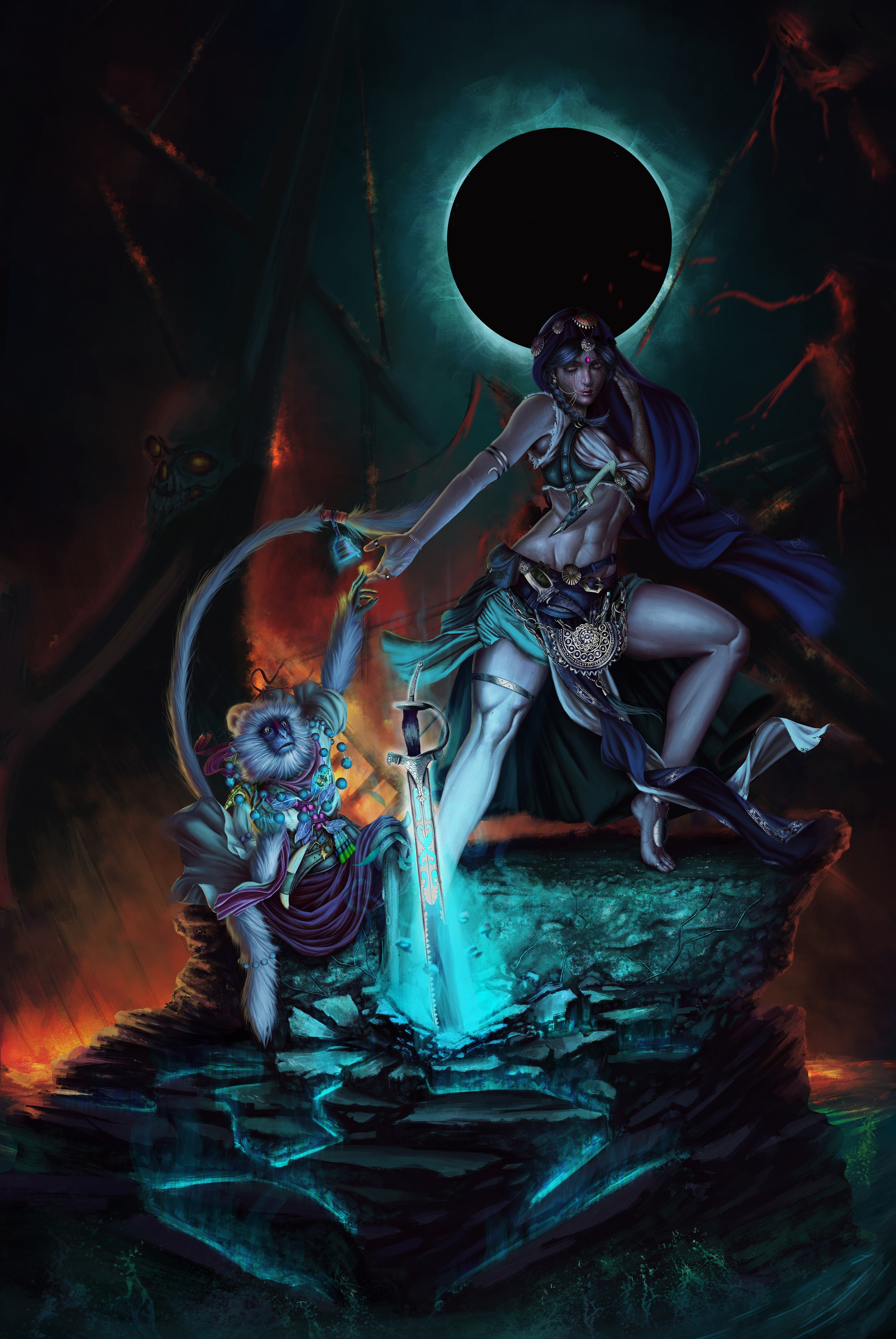 Son Khanda, planté dans la roche, se réveille par l’alignement des astres. Cette lumière froide éclaire son visage fermé, déterminé, presque grave. Neela n’est ni surprise ni effrayée : elle accepte ce moment, consciente de son poids.
