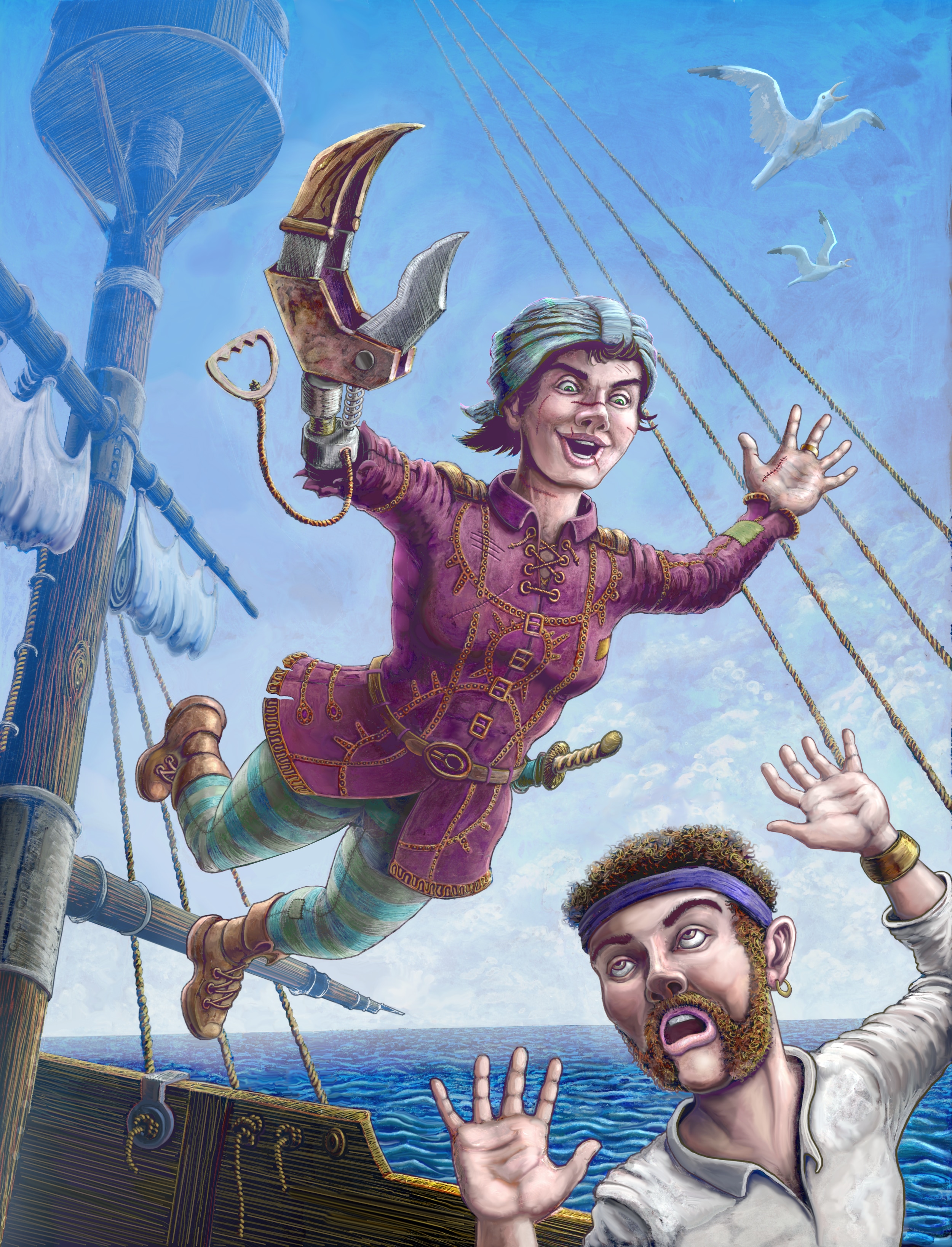 La description de Gropoings m'a tout de suite inspiré des images dynamiques, une pirate intrépide et impulsive. Après une série de croquis sur la composition, la prothèse, et les vêtements, puis des recherches sur les bateaux d'époque, j'ai réalisé ce croquis final.