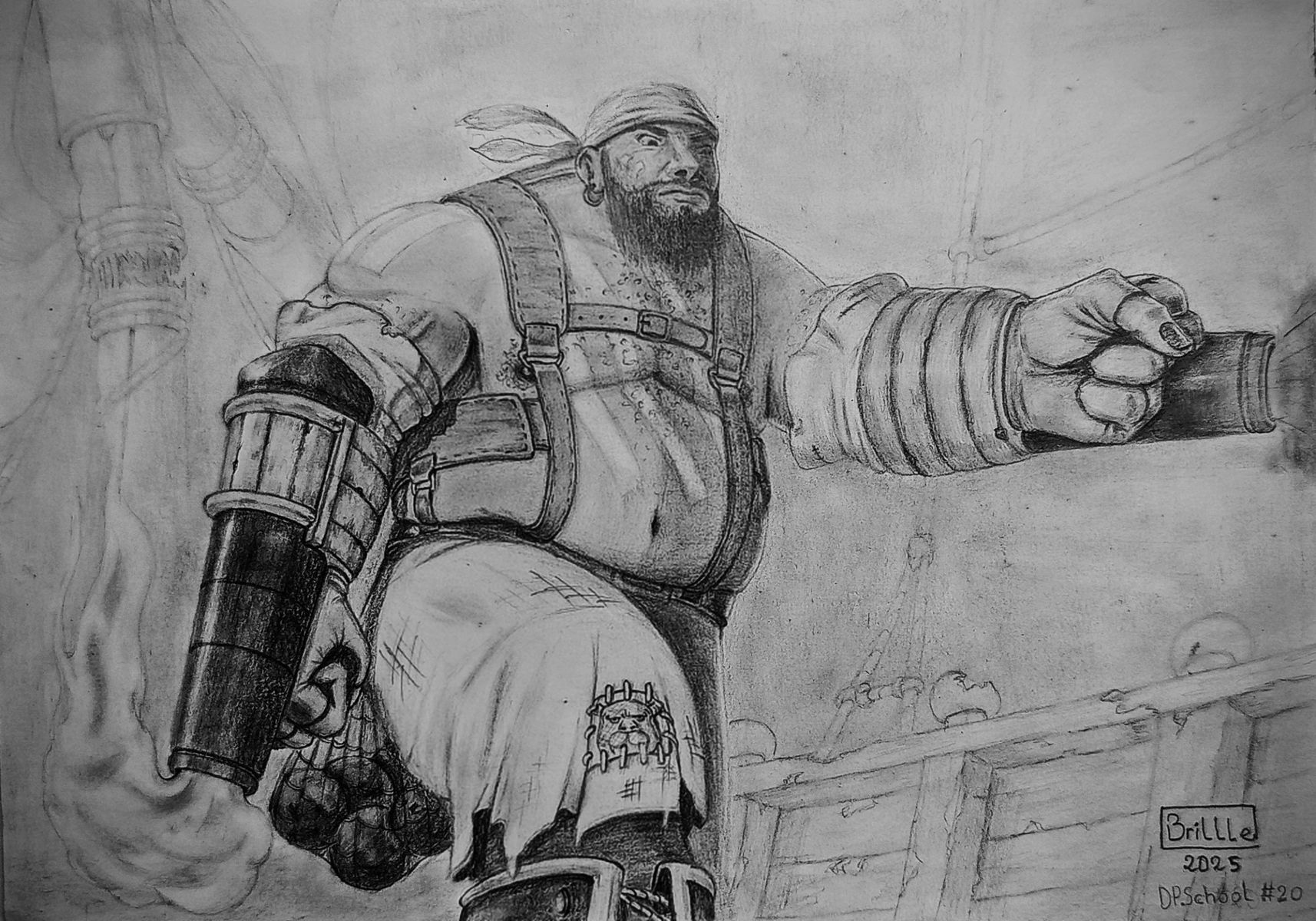 Cette fois, j’ai choisi de représenter Roger Boom-Boom, le pirate recherché au physique colossal et aux canons intégrés. J’ai essayé de capter toute sa puissance et son côté explosif.