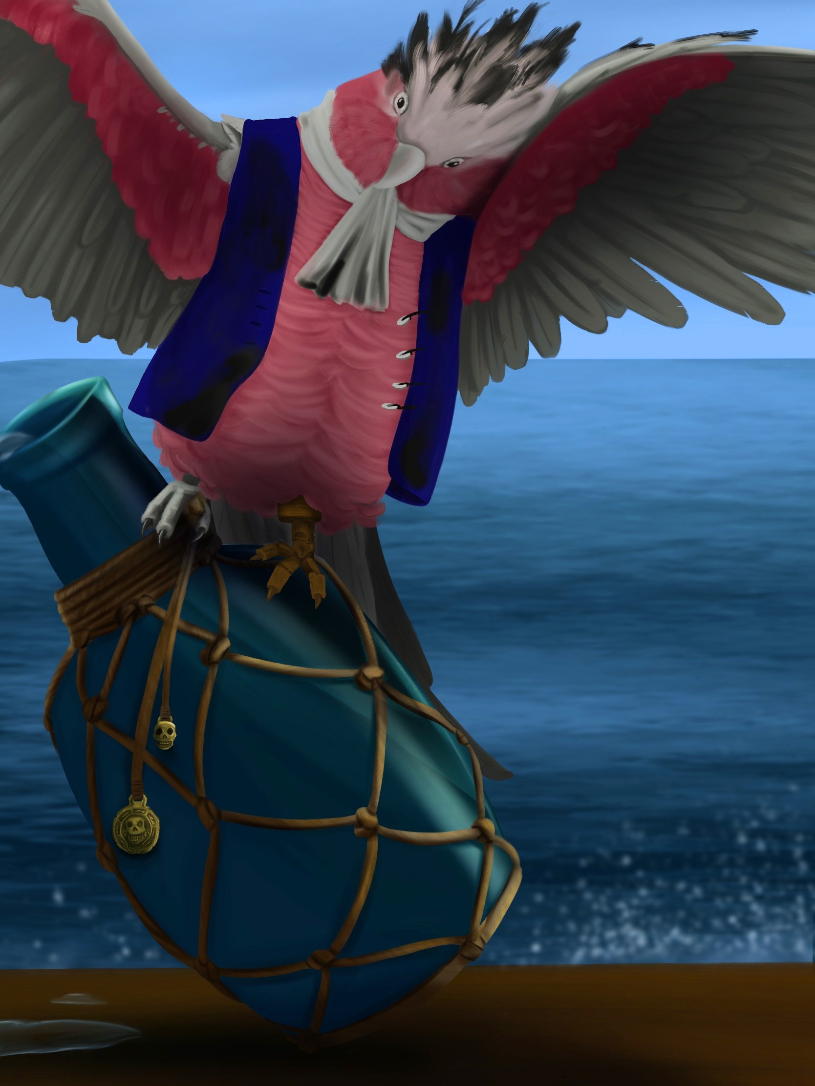 Ce Perroquet complétement barré a tendance à aimer s'approprier les bouteilles de rhum. Il se peut que ce soit son addiction qui l'ai amené un peu trop prêt du feu, d'où l'état de ses plumes. Quand à sa prothèse en bois, il a du s'estimer heureux que le charpentier de l'équipage soit aussi doué. Les griffes sont mobile ce qui lui permet de garder son équilibre en toutes circonstances.