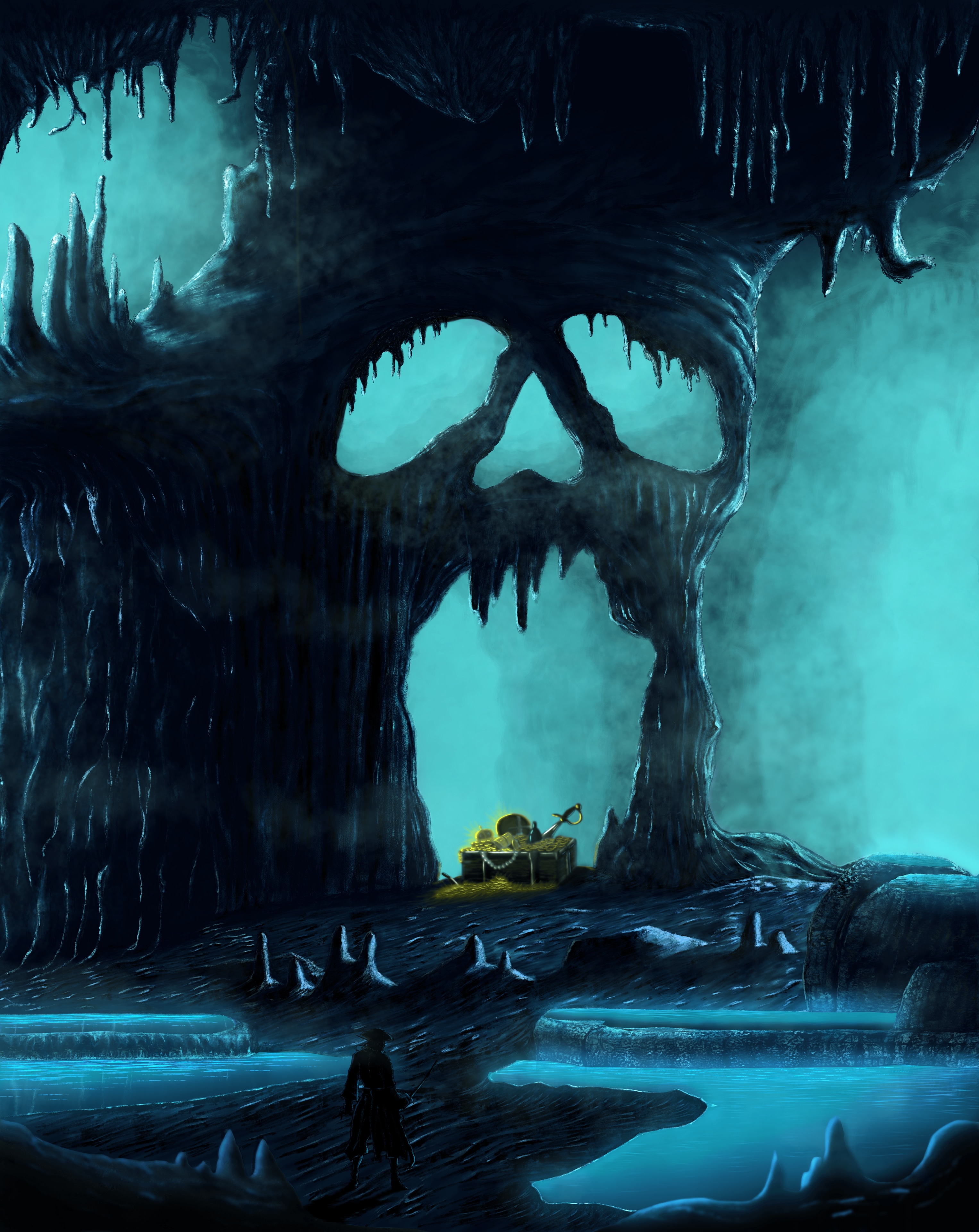 J'ai choisi le thème environnement sur la cachette du trésor du Black Bones. J'ai voulu porté l'attention sur la forme de la caverne en lui donnant un aspect à la fois terrifiant et étrange : la forme du crâne peut laisser pensé que la caverne a été abandonnée depuis très longtemps et qu'un malheureux qui a tenté de s'emparer du trésor a été figée et momifié dans la roche et que le crâne de celui-ci montre sa perte et sa tristesse d'avoir été trop ambitieux. Le pirate qui se présente à l'entrée ignore tout se qui c'est passé et avec incertitude tente lui aussi d'approcher le trésor.