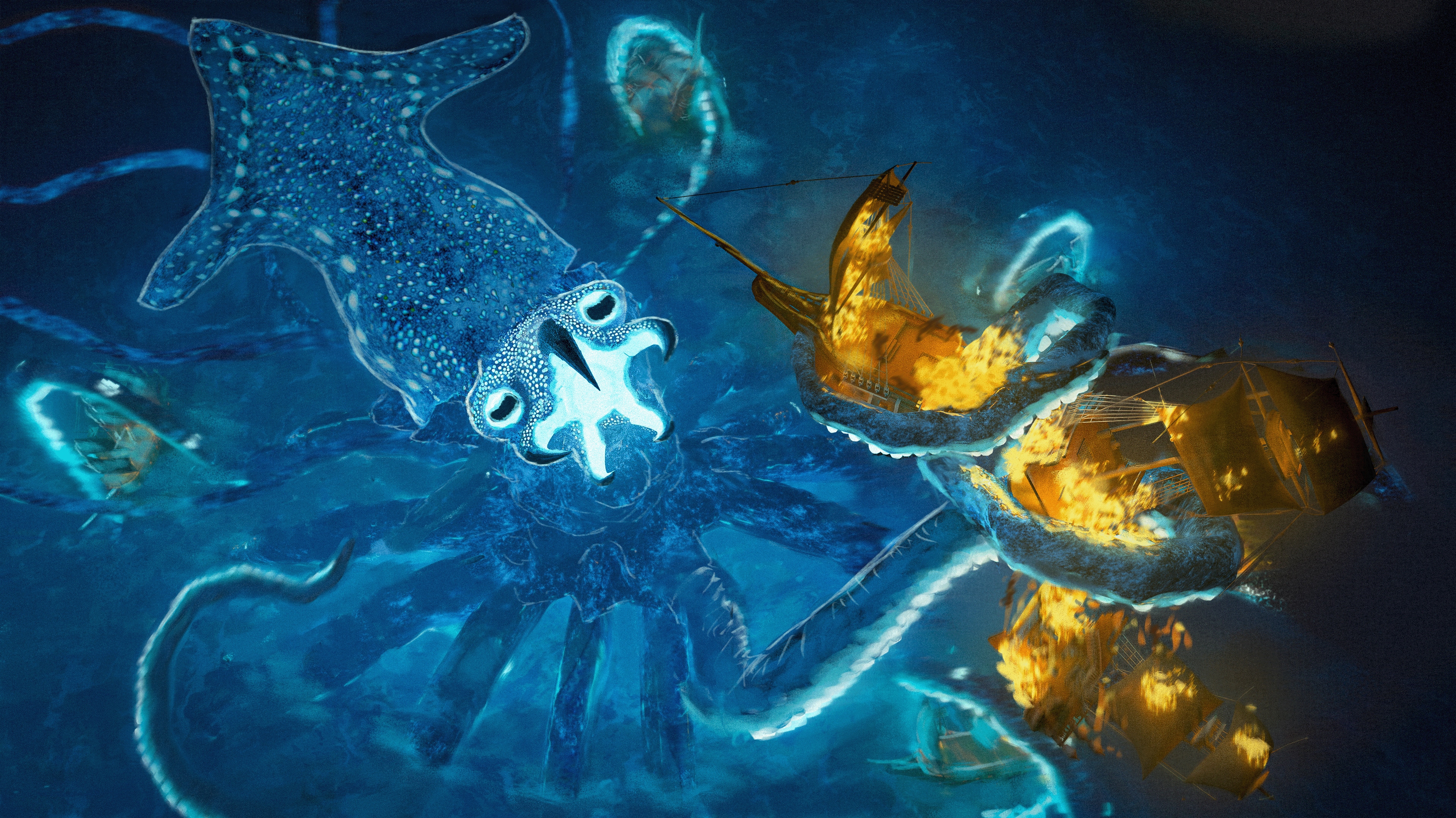 Le Kraken est une gigantesque créature des profondeurs, bioluminescente, dotée d'une vingtaine de tentacules et de deux bras armées de huit tentacules chacune. Lorsqu'il est dérangé, notamment par les flottes de pirates, il remonte à la surface à toute vitesse et réduit en cendre les malheureux vaisseaux.