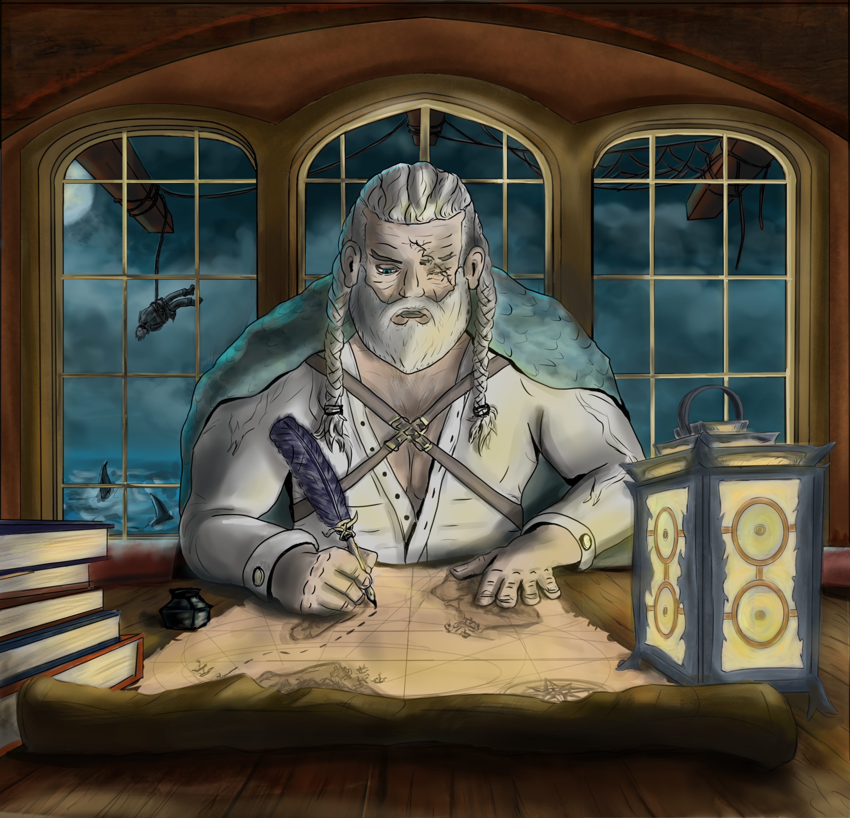 Hello, j'ai choisi de représenter le roi viking, dans un petit décor assez cosy, pour contraster avec ce monsieur tout en muscle. Je l'ai imaginé en train de composer une carte au trésor ou de bataille dans la cabine du capitaine. J'avais pleins d'autres idées mais je n'ai pas pu tout mettre et parfois si on en met trop on perd lisibilité. bonne revue à tous. MisterJ