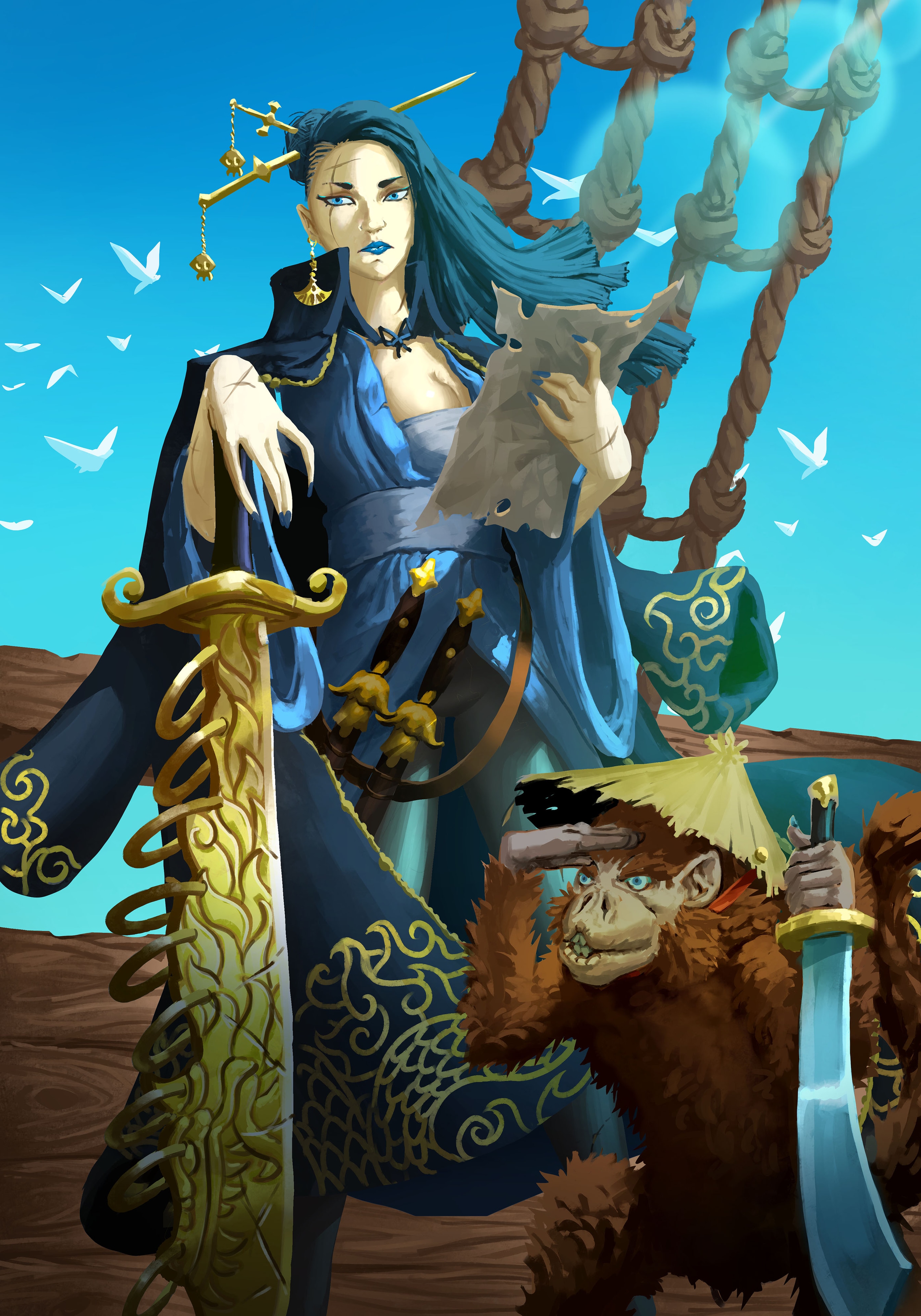 Aux vues du brief, j'ai décidé de reprendre des éléments traditionnel chinois (épée aux neufs anneaux, épingles à cheveux, robe,...) pour les mixer avec le coté rebelle de la piraterie. Mon objectif était d'avoir un personnage à l'allure noble et autoritaire, digne de commander un navire et de terrifier les marins. Et pour le singe, j'ai décidé d'opter pour un design un peu décalé, pour dénoter avec le personnage de Lame Bleue, et pour apporter un peu de la bouffonnerie propre à l'univers des pirates.