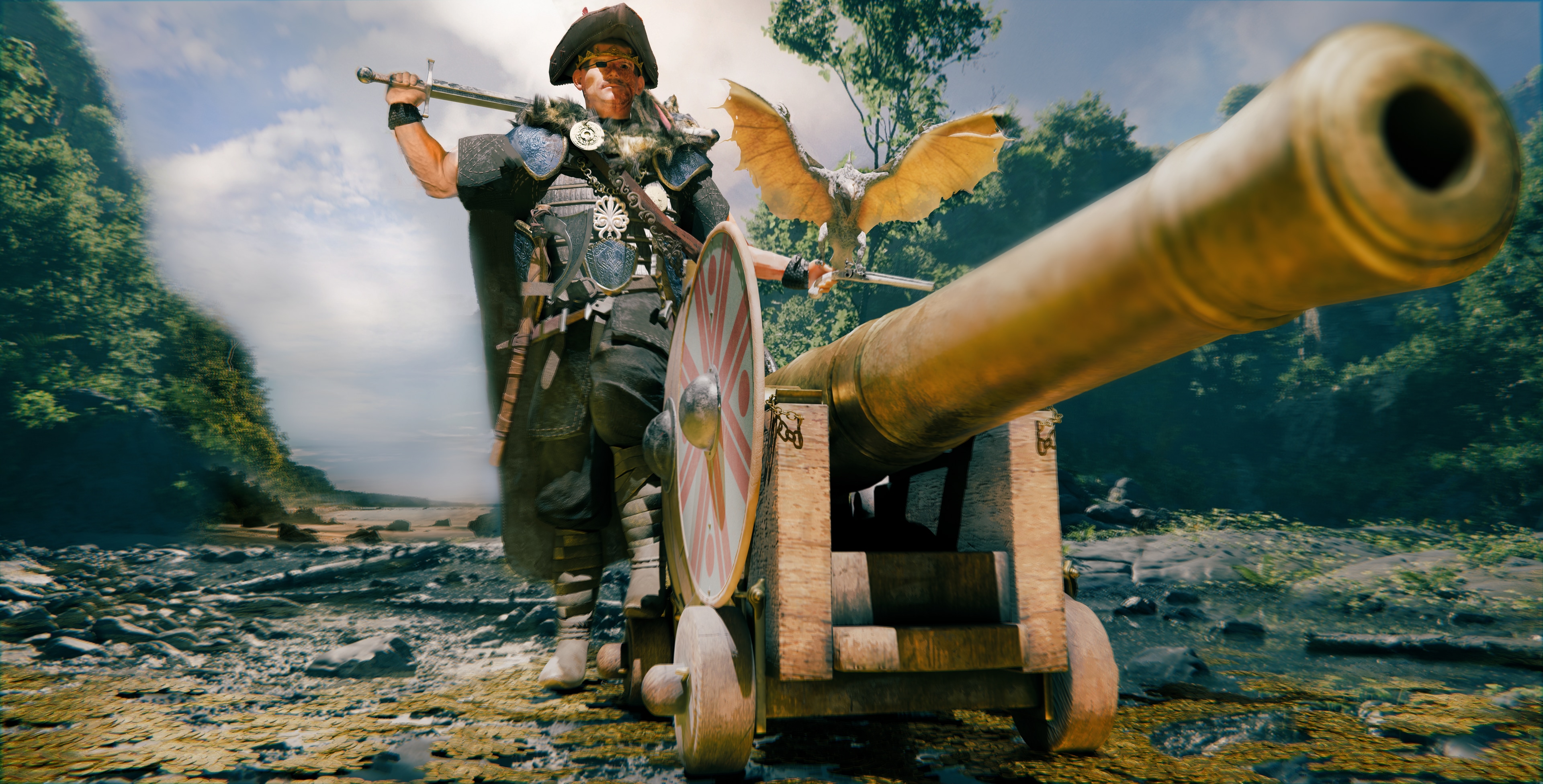 J'ai choisi de travailler un personnage, en mode 3D character artist/lighter/lookdev/generalist. Mon intention était de mélanger de façon élégante les styles d'un pirate et d'un viking, afin de montrer clairement les deux styles bien marqués. J'ai utilisé des assets libres que j'ai rescale et ajustés pour composer mon character. J'ai utilisé Blender, (avec Rigify) et Krita, un petit peu Zbrush. L'environnement est en grande partie composé d'assets libres rendus dans un projet Unreal Engine. J'avais comme référence principale sous les yeux la pochette de mon jeu Valhalla, posée sur mon bureau.