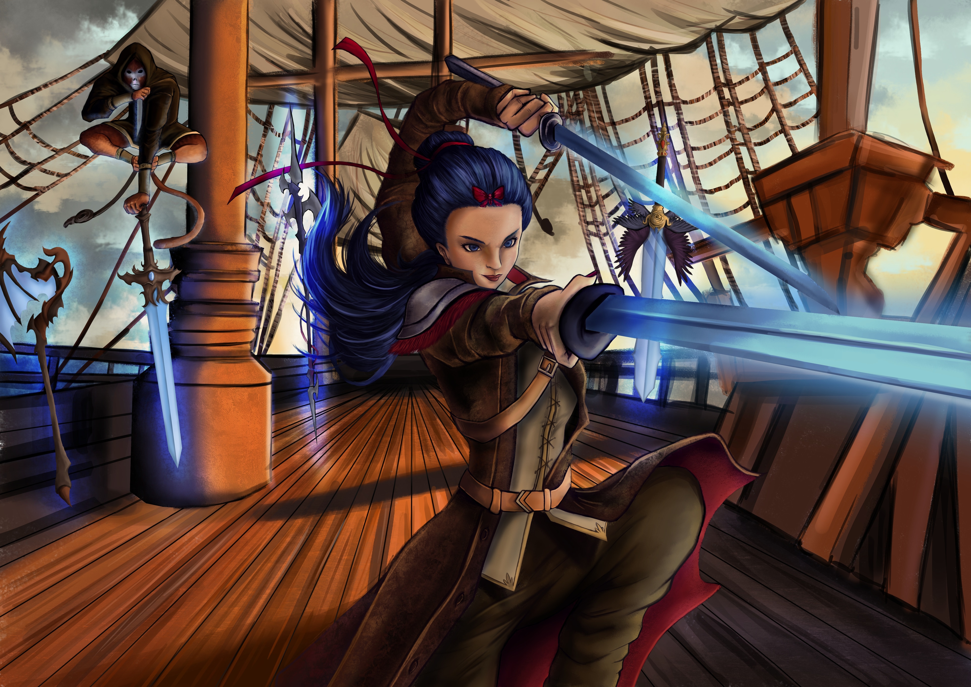 Lame bleue est une capitaine pirate redoutée, cinquième sur la liste des plus recherchées. Svelte et d’une beauté marquante, ses origines orientales lui confèrent une aura mystérieuse. Maîtrisant les lames de toute taille, elle est aussi redoutable dans le combat rapproché que sur les mers. Depuis son adolescence, elle est accompagnée d’un singe énigmatique qu’elle a sauvé, fidèle compagnon de ses aventures.