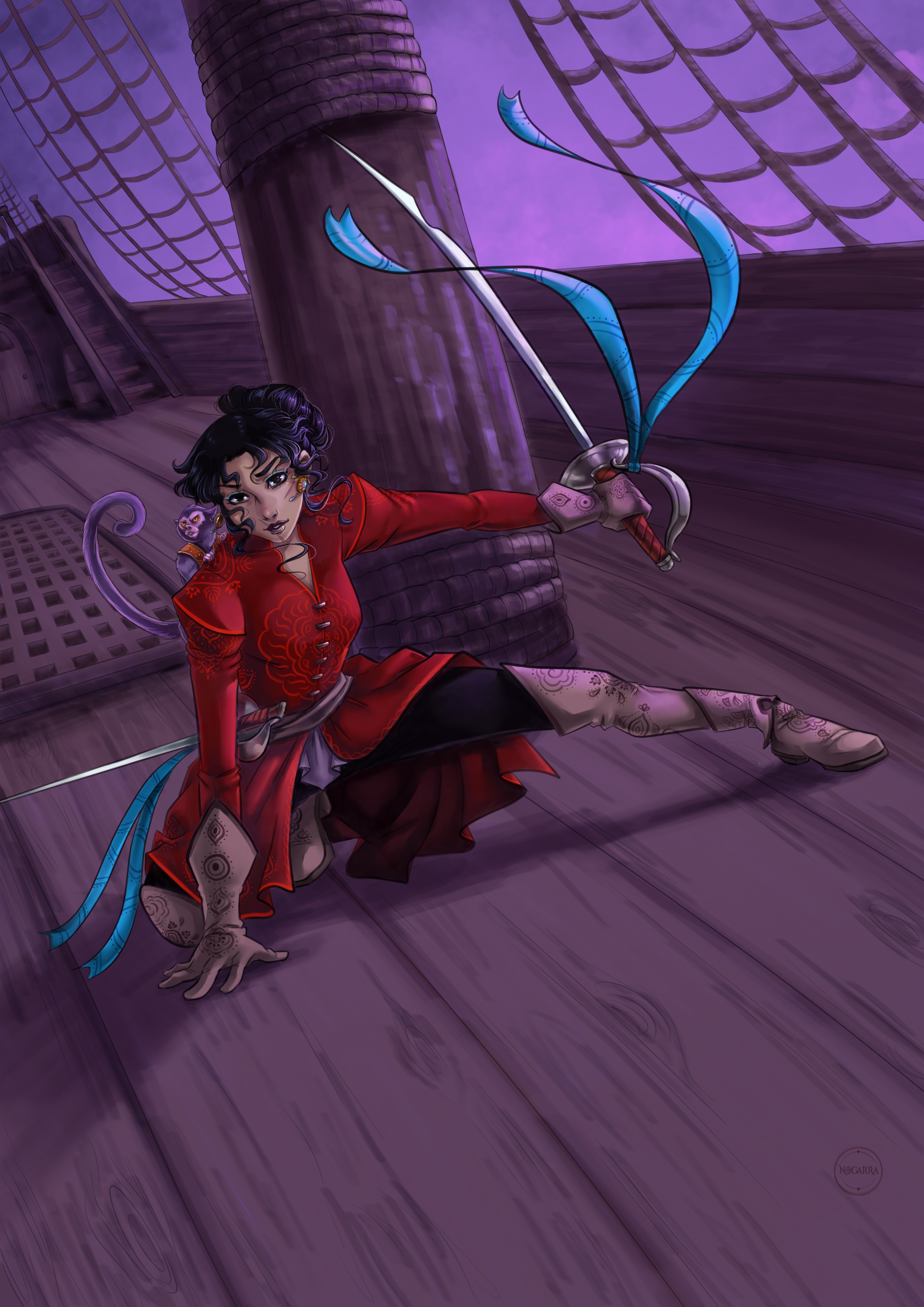 Je poste enfin ma participation ! J'ai eu peur de ne pas finir dans les temps mais la voilà ! Pour l'histoire de ma participation, j'ai choisi lame bleue parce qu'elle m'inspirait et le fait qu'elle soit accompagnée de son petit compagnon singe me rappelait un de mes personnages. Du coup j'ai essayé de respecter le brief au mieux, en évitant, je l'espère, de tomber dans le piège dû à son nom. Je ne voulais donc pas qu'elle ait des lames bleues, ni qu'elle soit habillée en bleue, ni que ses cheveux soient bleus etc...J'ai donc opté pour des accessoires bleus comme les rubans qui décorent ses sabres et qui font comme des éclairs dans l'air lorsqu'elle manipule ses lames. Je me suis dit après coup que des rubans, ça pouvait être gênant, puis je me suis dit qu'on était dans un univers fantasy, j'ai donc opté pour le TGCM, pour ceux qui ont la référence ^^