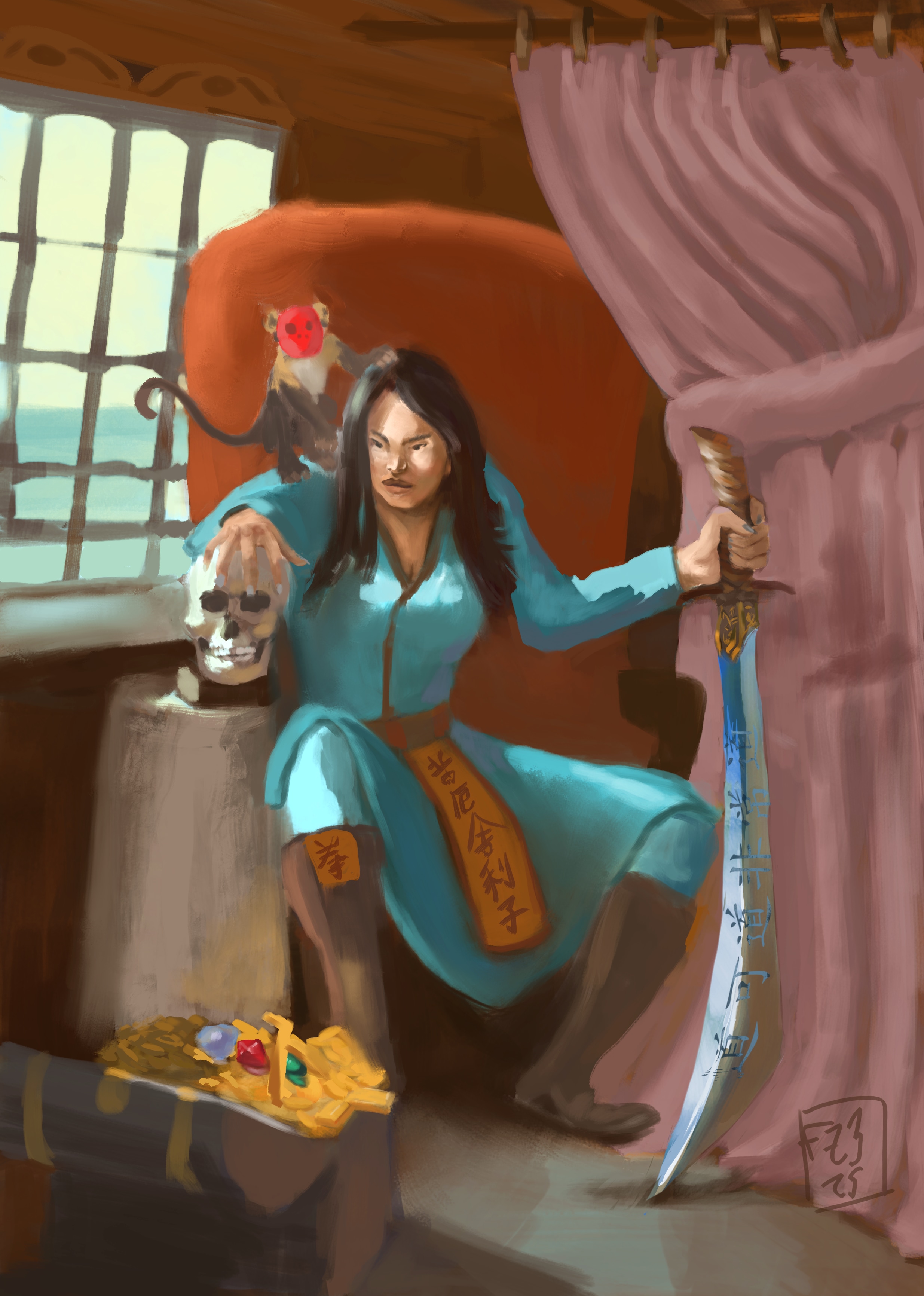 Je suis parti dans plein de directions différentes avant d'avoir l'idée finale. J'avais par contre toujours l'intention de représenter Lame Bleue en pirate chinoise.