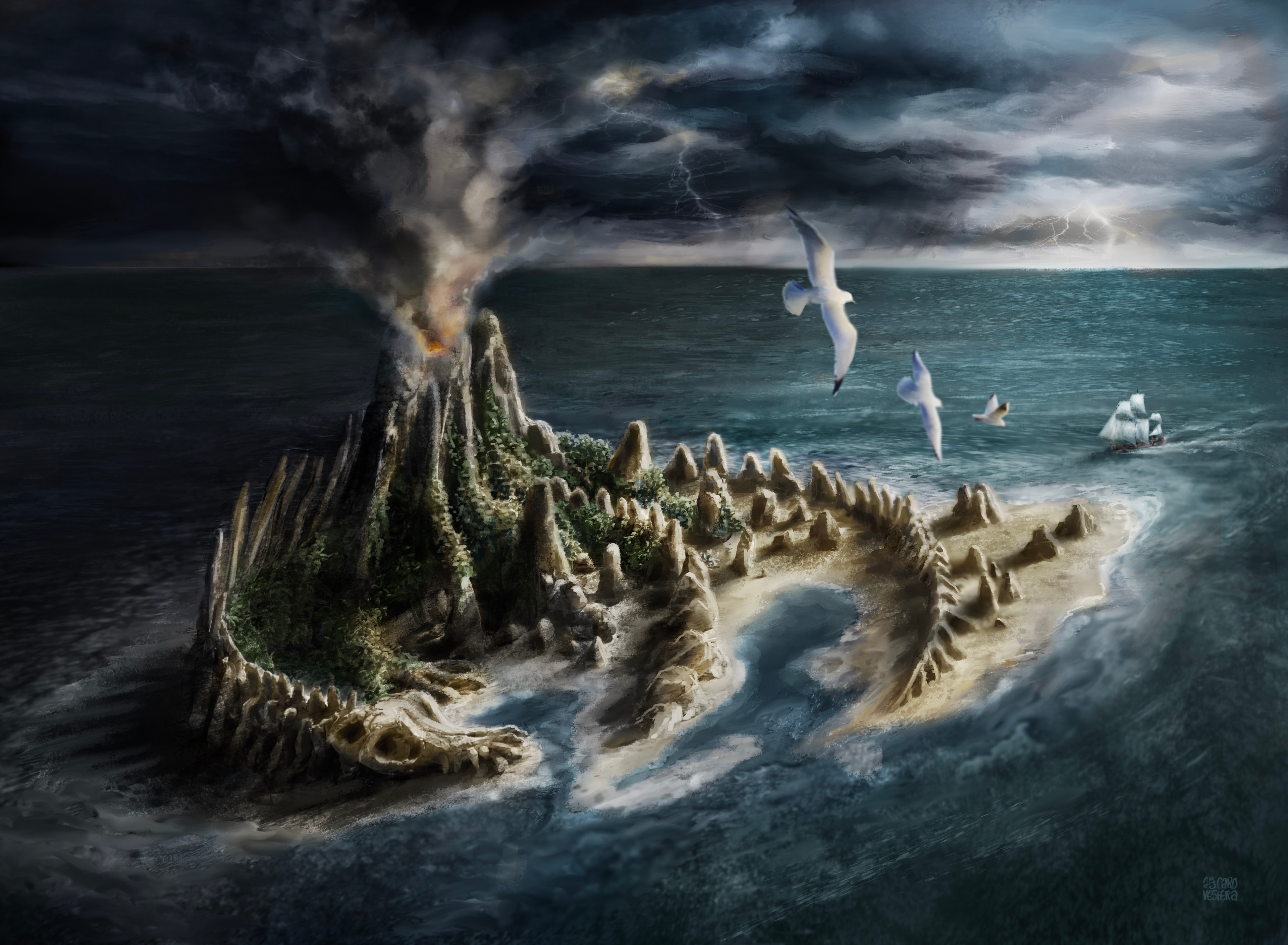 Je voulais que l'île-volcan soit structurée sur la base d'un immense squelette de dinosaure.