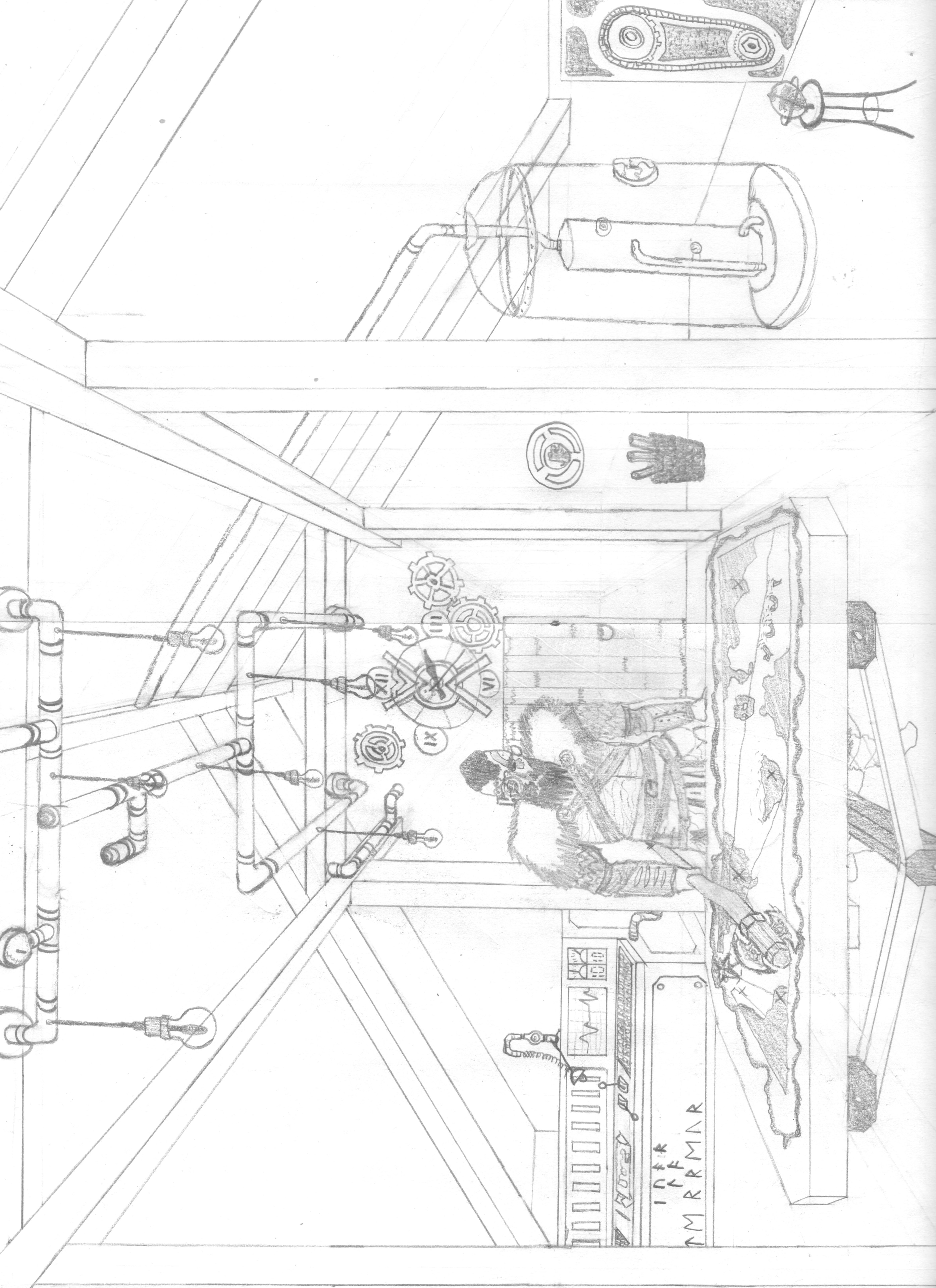 Pour rendre le tout plus intéressant, j'ai agrémentée l'illustration par des éléments de décors inspirés du steampunk, issus des inventions personnelles d’Ivar, développées lors de ses passages sur le continent. Rendant l'allure de l'intérieur plus moderne, contrastant avec la culture viking. L’éclairage provient de plusieurs lampes mécaniques fixées au plafond, attachées à des tuyaux et tubes fixés au plafond, et autour de sa table, plusieurs chaudières et générateurs permettent à l'ensemble du mécanisme de fonctionner efficacement. Gardant la cabane au chaud et la lumière assurée à chaque moment du jour et de la nuit, à la convenance du capitaine ! Dès que l'envie lui prend de venir étudier les cartes de nouvelles contrées découvertes pour voir où dénicher de nouveaux trésors, il suffit de taper des mains et la lumière fut ! Le décor est complété par une horloge murale fonctionnant grâce à des engrenages et mécanismes, qui apporte à la pièce un léger cliquetis constant apaisant Ivar dans son étude et sa réflexion.