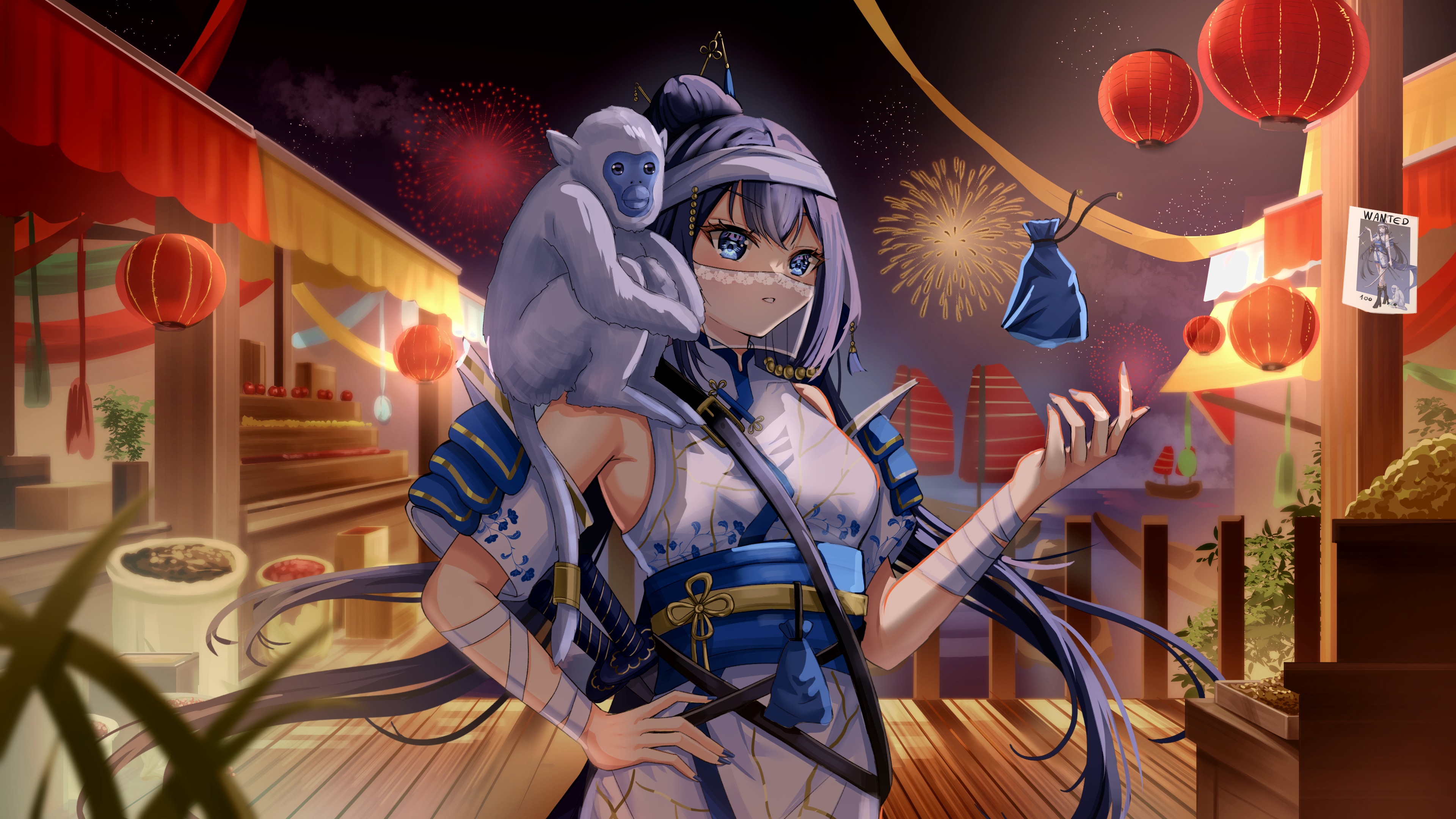 J'ai ensuite commencé l'illustration, je voulais créer une scène dans laquelle Lame Bleue volait sur des étals dans un port avec l'aide de son petit singe. J'ai donc fait plusieurs petits croquis rapides pour trouver une composition qui me plairait.