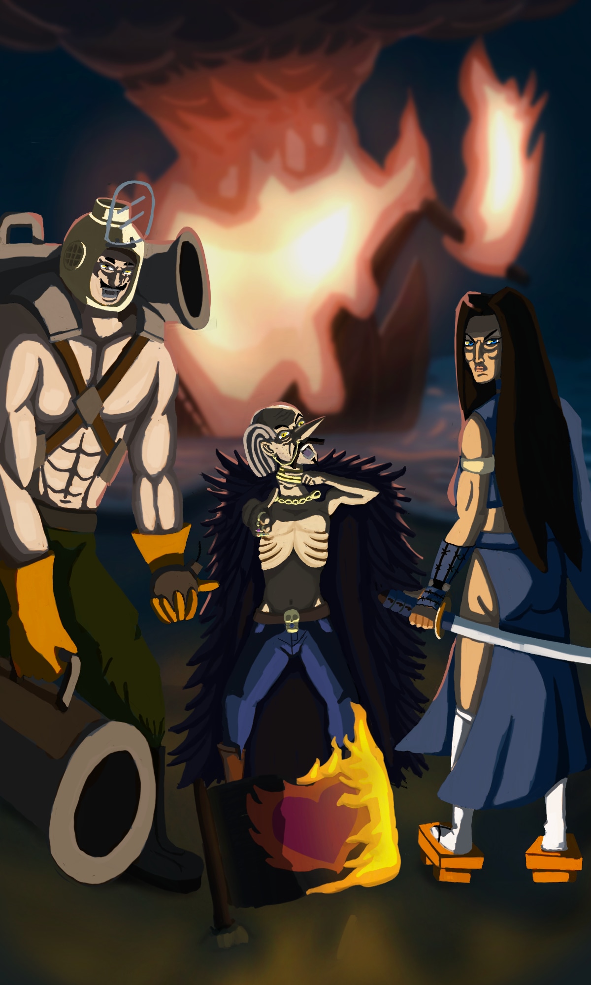 Je voulais donc représenter une scène dans laquelle les trois pirates formeraient une alliance. On les verrai menaçant, dominateur et vainqueur contre leur opposant.