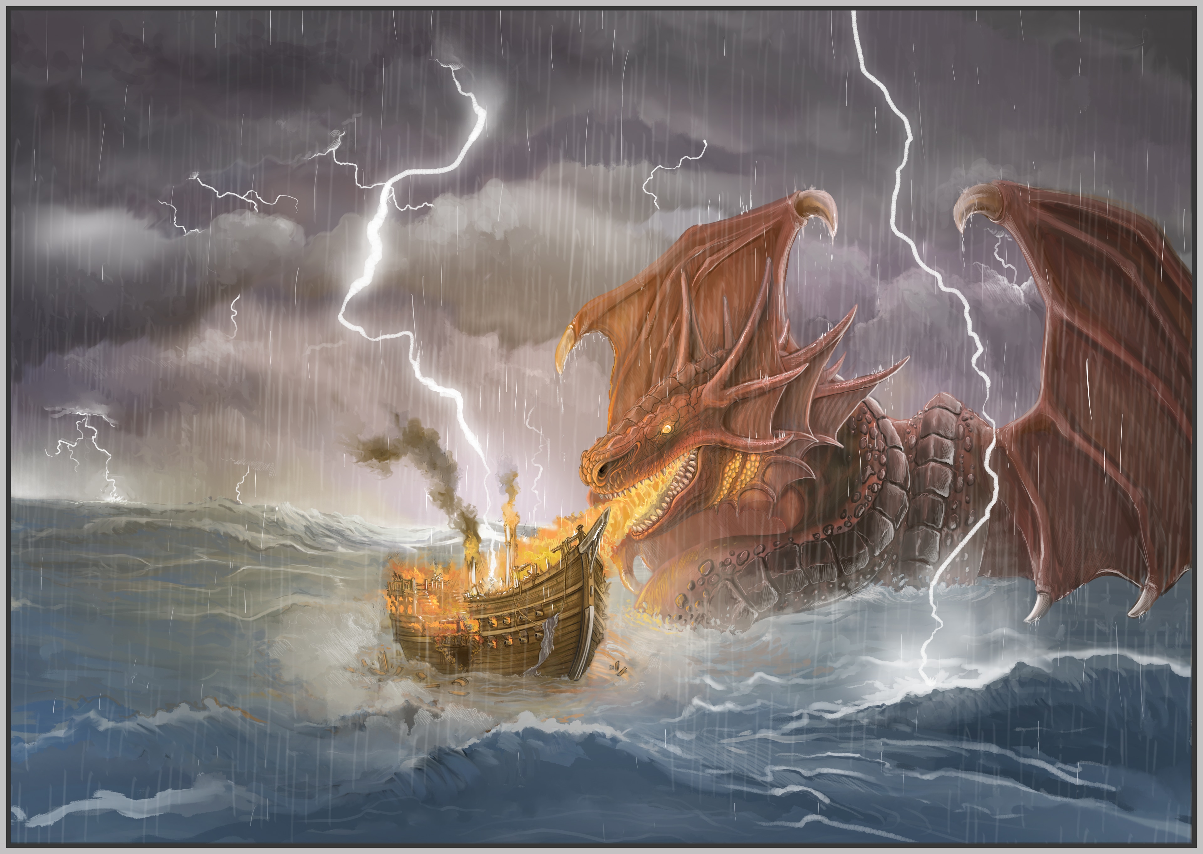 Niðhøgg jaillit dans une explosion d’écume, immense, rouge comme la lave en fusion, ailes déployées sous les éclairs. Son ventre incandescent se mit à irradier la tempête d’une lueur infernale, comme si l’enfer lui-même s’ouvrait à travers sa silhouette.