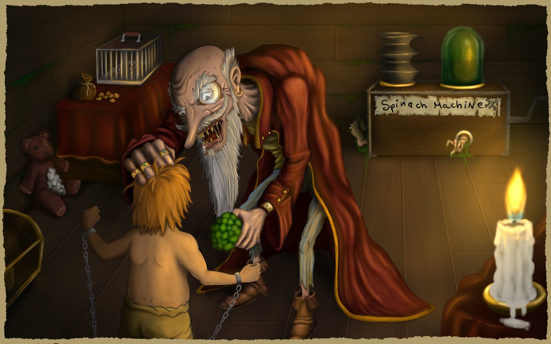 Gopperus a su tourner en dérision ce personnage tortureur d'enfants en le présentant de manière humoristique. Son arme de prédilection : brocolis et épinards... Ils n'avaient qu'à bien se tenir... Bravo pour l'imagination !