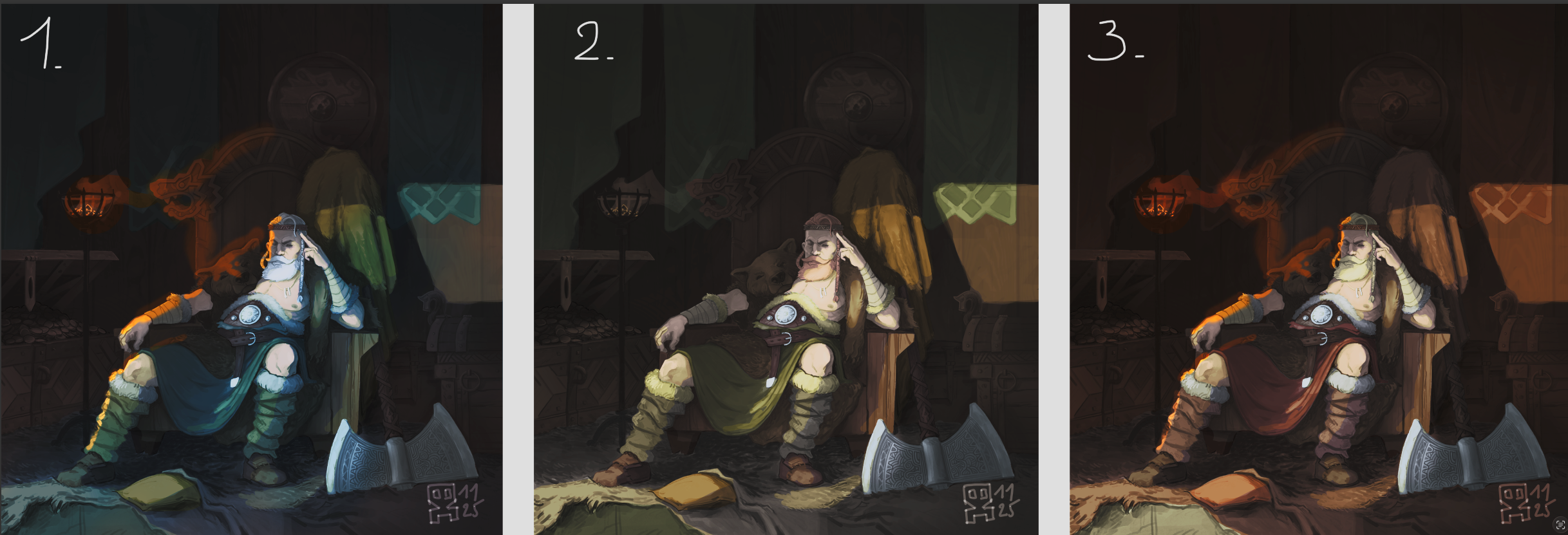 perso la 1 ou la 2 avec probablement une pref pour la 1. Attention à ta torche/brasero à gauche qui emettra un peu de lumière rougeatre/jaune0 (en restant subtile mais permettra aussi de faire des highlight sur ton perso et la tete d'ours. D'ailleurs ca peut etre un cool effet de chaud/froid sur ta scene (si tu passes lumière principale en froide. Très abusé par Blizzard comme style mais trèès efficace.