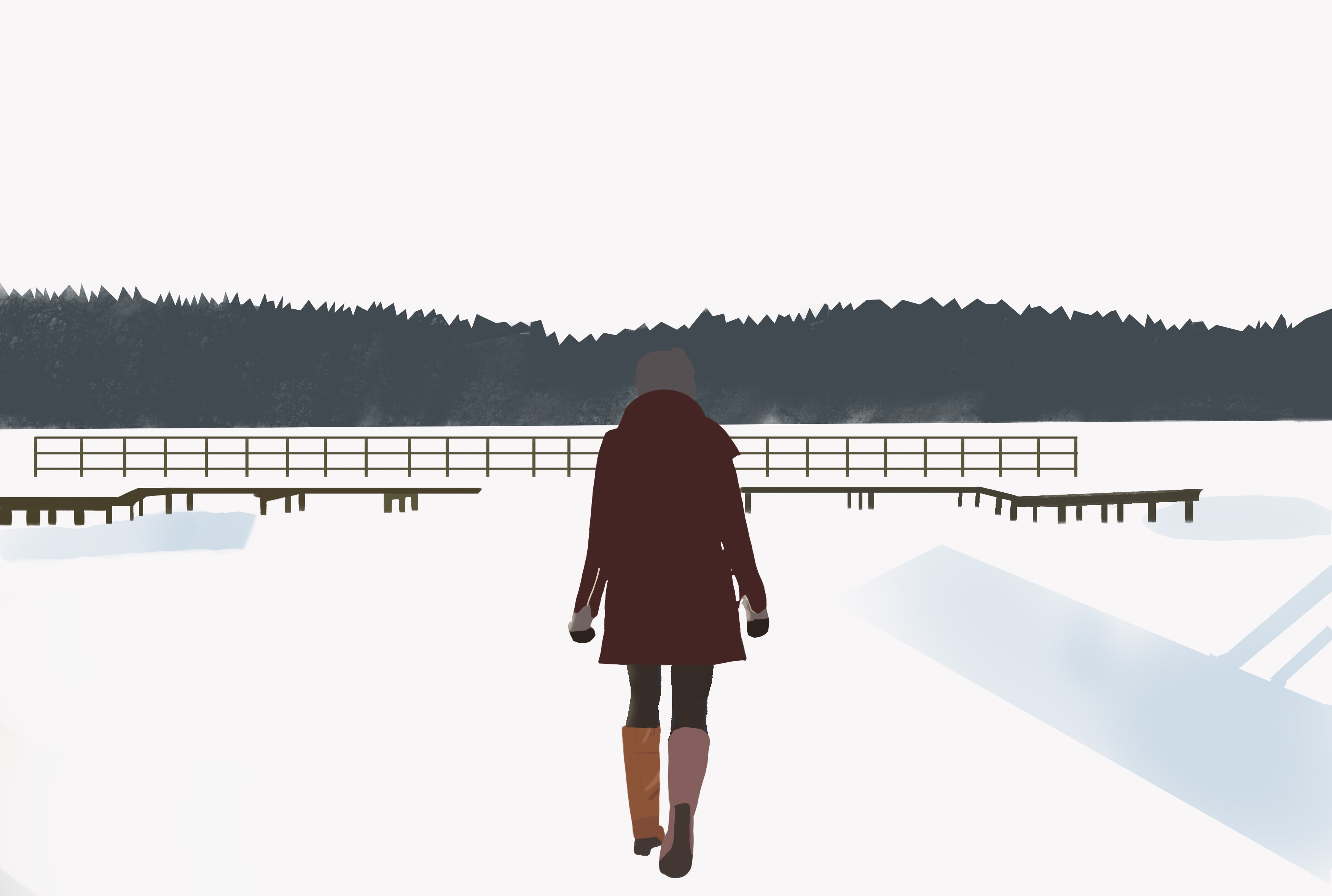 J'aime beaucoup ton illus. Ne lâche rien. Je suis d'accord avec @Bastien CH pour élargir un peu ton dessin pour "respirer" un peu plus et je jouerai sur la perspective atmosphérique pour éloigner les deux personnages du fond et ainsi faire ressortir ton personnage. En plus ton soleil étant très bas c'est dommage qu'il n'y ait pas plus de lumière chaude rasante. Tu pourrais ainsi à l'opposé mettre un peu plus de bleu pour faire un contraste et faire encore ressortir ton perso. C'est beaucoup d'info alors je t'ai fait un PO à l'arrache pour que tu comprennes mieux.