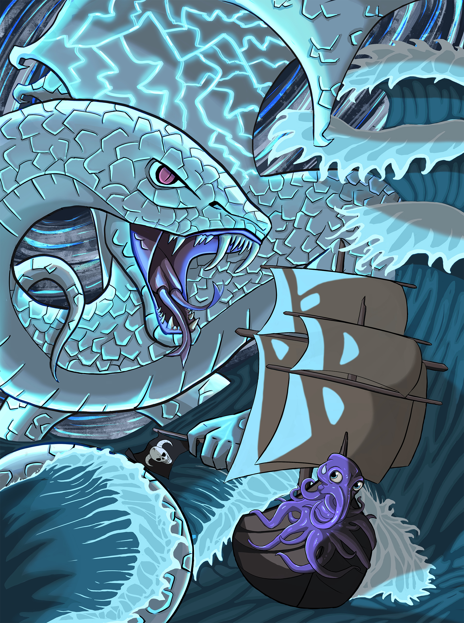 ETAPE 4 (j'accélère un peu dans les étapes) : - j'ai fais le bateau et le petit kraken - j'ai créé une ambiance tempêtueuse - j'ai posé les lumières/ombres. Je dirais que je suis arrivé maintenant à 80% du process mais ça m'a pris un temps fou : Voilà pour l'instant je suis arrivé à ce stade là. Il me reste deux jours pour améliorer tout ça et corriger les plus gros défauts (si j'arrive à le faire dans le temps imparti). Si vous avez des conseils/recommandations d'amélioration je suis bien sûr preneur 😄 L'idée de L'illustration et de montrer un Nidhögg affamé et bien énervé qui pourchasse un pauvre petit kraken en devenir. le petit Kraken ayant en effet eut l'audace de prendre pour cible un bateau qui passait par là...Le céphalopode se cache à présent à l'avant de la coque du bateau et s'y accrochant désespérément dans l'espoir de ne pas être repéré par le serpent titanesque. SI j'ai réussi à vous décrocher un petit sourire, j'aurai au moins réussi mon objectif. 😁 -