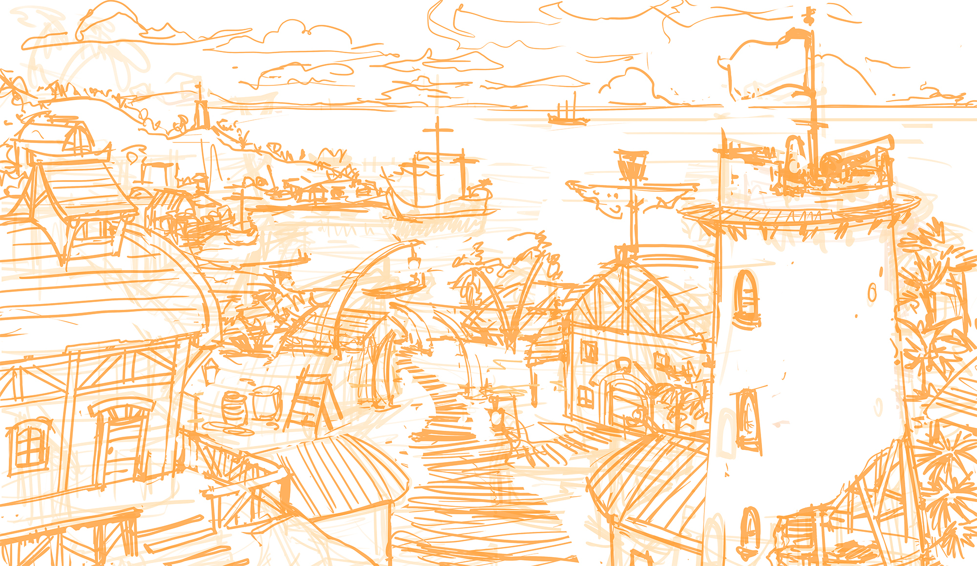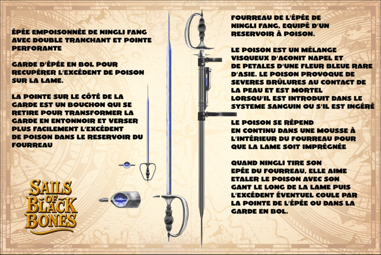 L'épée et le fourreau, les deux accessoires majeurs pour ce personnages. Ils ont été pensé de manière à être crédibles pour l'époque et pratiques en situation réelle. Le premier design de l'épée (sur la gauche) à été retravaillé légèrement pour qu'il fasse plus pirate avec la coque de garde plus large et sur un seul côté . Le design de la fusée à été inspiré des lanternes chinoises en forme de boule. -