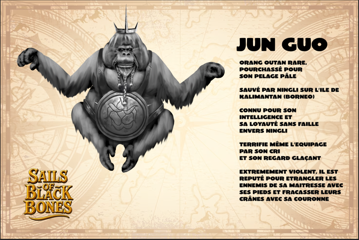Je voulais que la couronne restent dans cette cohérence d'objet pointus mais qu'elle semble également appartenir à une autre époque étant donnée que c'est un trésor volé. Pour le plastron, j'ai volontairement cherché à le faire ressembler à un bouclier car ça correspond facilement à la forme ronde du ventre des orangs outans. Je voulais que cet élément ait une allure d'objet "crafté" par une bande de pirate et leur capitaine pour donner du prestige à son compagnon et pas d'un plastron sur mesure. les gravures maladroites mais qui illustrent quand même quelque chose devait souligner une forme d'intelligence naturelle de son orang outan, tout en contrastant avec le design rond du bouclier et des cercles parfaits faits par l'homme. On dit que l'art est une forme de langage qui sert à s'exprimer et à communiquer sa pensée. Je pense, donc je suis. Par ces simples gravures je met en avant l'intelligence du singe et justifie pourquoi une bête sauvage accompagne un humain. -