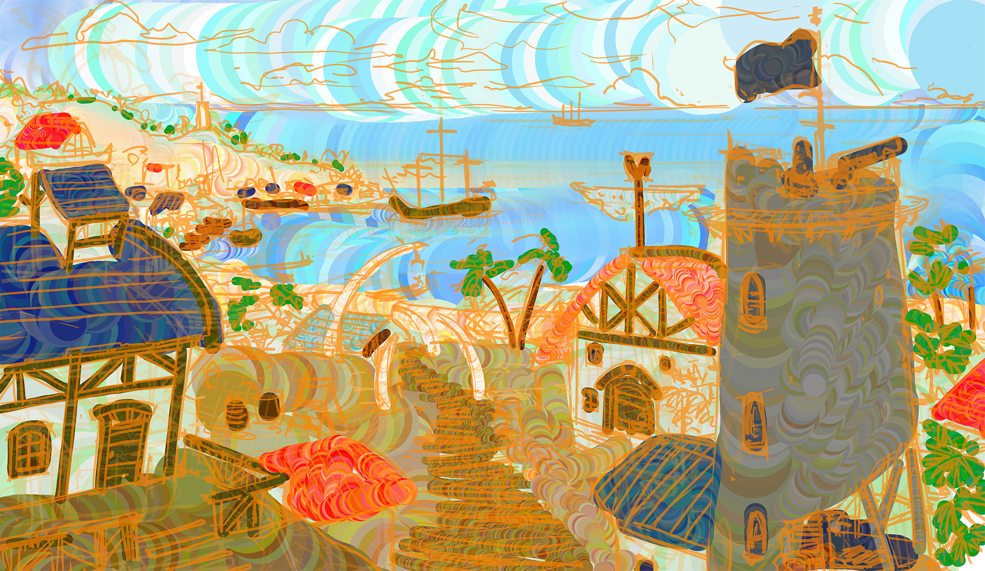 Pfioulala ça dépote, belles couleurs et belle ambiance. La mer est déchaîné! j'aime bien les lames bleues. Et tes singes sont super réussis, bravo ! -
