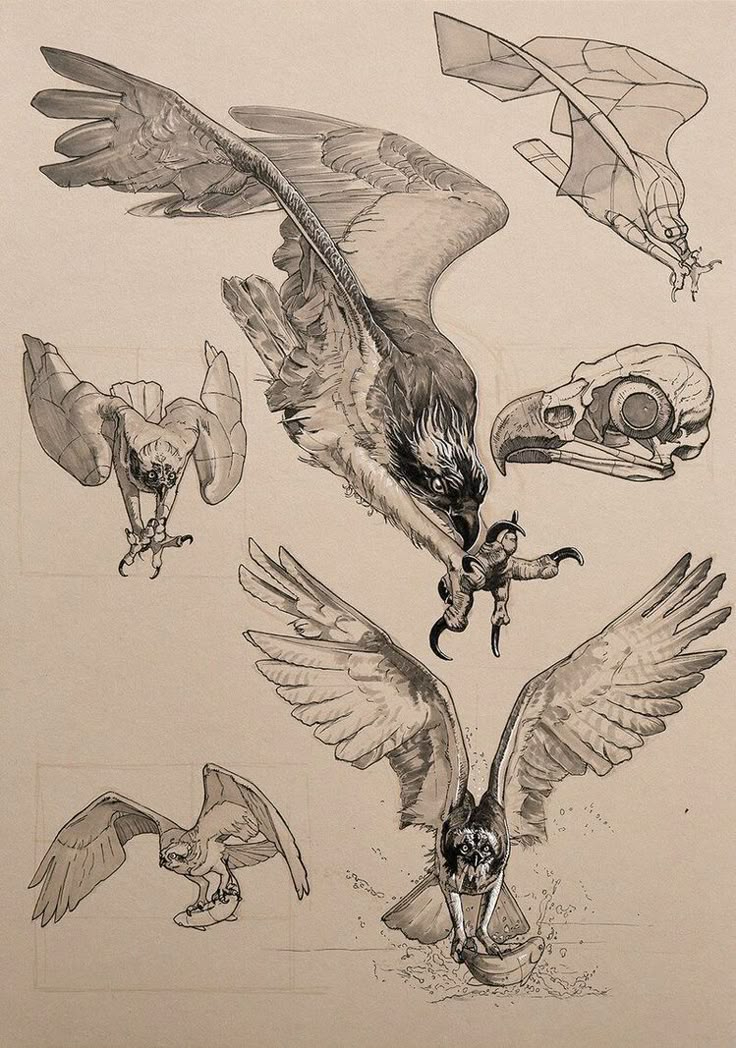 Ok je vois, super intéressant cette réf !! Si j'ai bien compris la pose que tu as choisie, c'est celle où l'oiseau est "plié" en deux, au plus fort de l'attaque. Je ne suis pas du tout un expert en perspective (ou en oiseaux^^), mais voilà une proposition très basique et schématique de comment je vois les choses : Tu as opté pour la forme 1, je pense que ça ressemblerait plutôt à la 2 ? C'est juste une histoire de où finissent les plumes de bout d'aile je pense ? Genre ça m'étonnerait qu'elles reviennent autant vers l'extérieur que sur la 1 ? À voir d'autres avis ! - Aujourd'hui