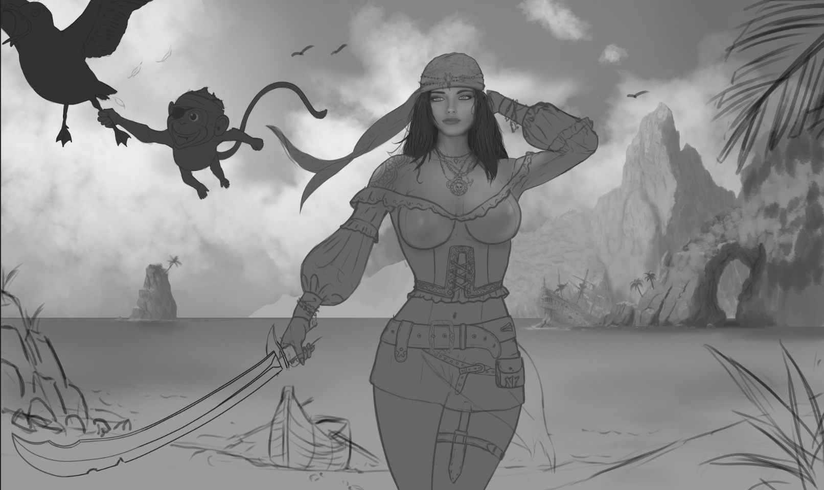 Bon je me suis attaqué à la tete ... je travaille en valeurs de gris je n'y arrive pas sinon ... je pense resté sur sur background et pas l'autre compo sur le bateau. Je trouve que ça respire plus...