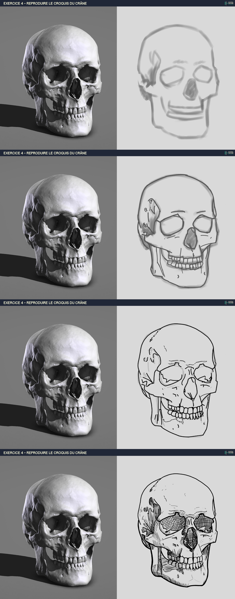 Bonjour, Voici ma proposition pour le croquis du crâne. Je suis partie de zéro, en utilisant la méthode de Spartan par étape. (je partage les différentes étapes). Comme pour les exercices précédents, je veux bien un retour sur mon travail, merci d'avance ^_^.