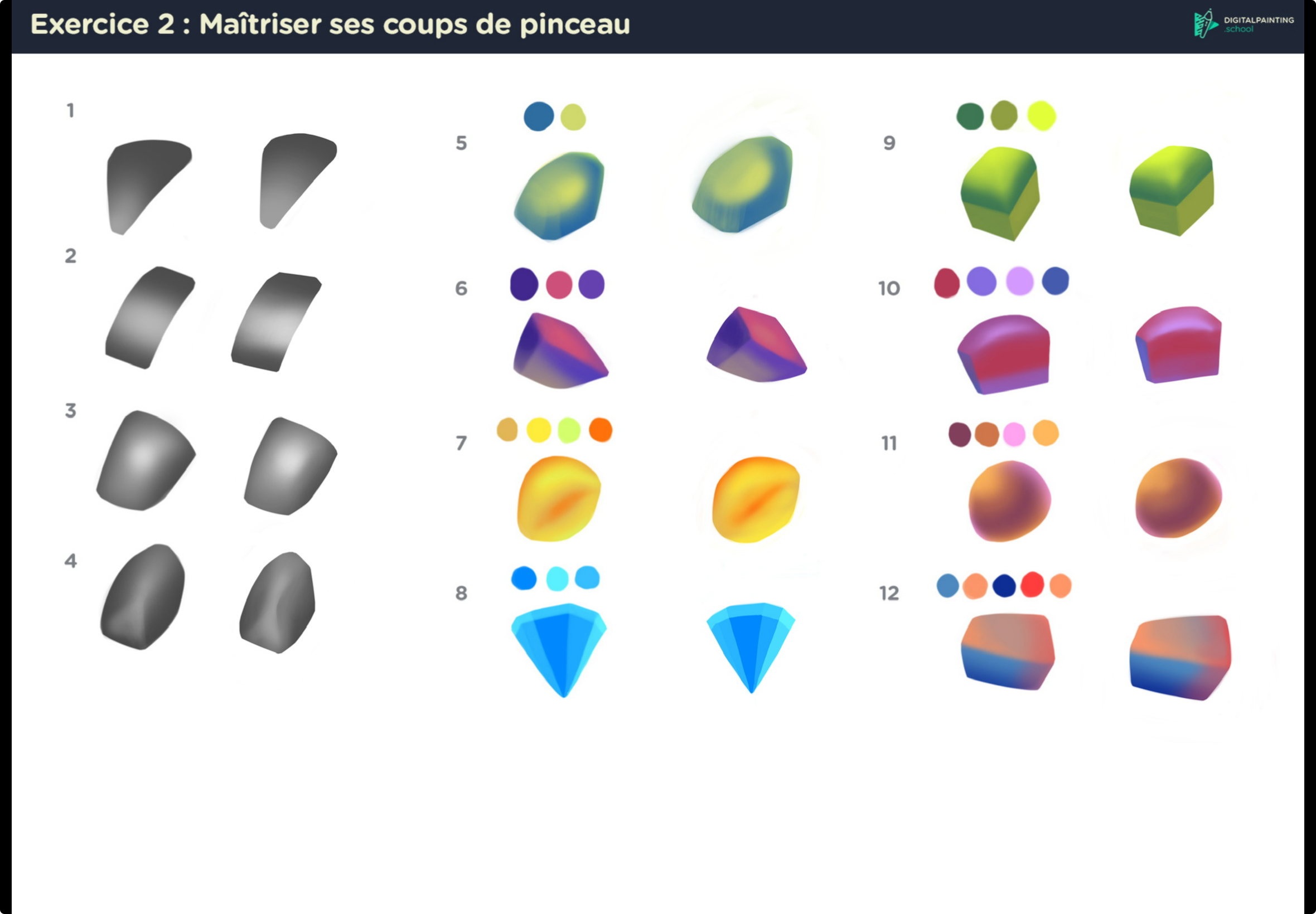 Bien le bonsoir ! Début des exercices. Particulièrement intéressée par le brush, car je suis plus familière du lasso que de la partie "painting" avec une brush. Très plaisant de sentir que l'exercice devient plus fluide au fil des formes !